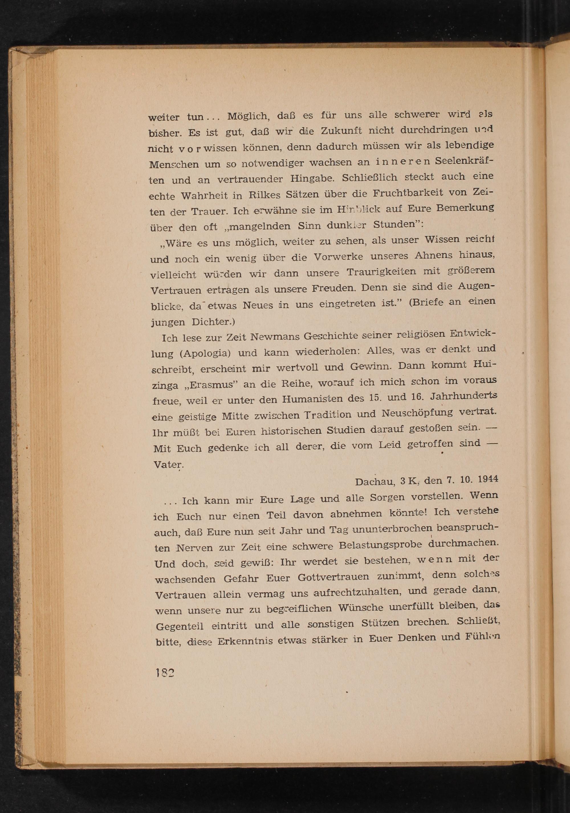 weiter tun... Möglich, daß es für uns alle schwerer wird als bisher. Es ist gut, daß wir die Zukunft nicht durchdringen und nicht vor wissen können, denn dadurch müssen wir als lebendige Menschen um so notwendiger wachsen an inneren Seelenkräften und an vertrauender Hingabe. Schließlich steckt auch eine echte Wahrheit in Rilkes Sätzen über die Fruchtbarkeit von Zeiten der Trauer. Ich erwähne sie im Hinblick auf Eure Bemerkung über den oft ,, mangelnden Sinn dunkler Stunden":