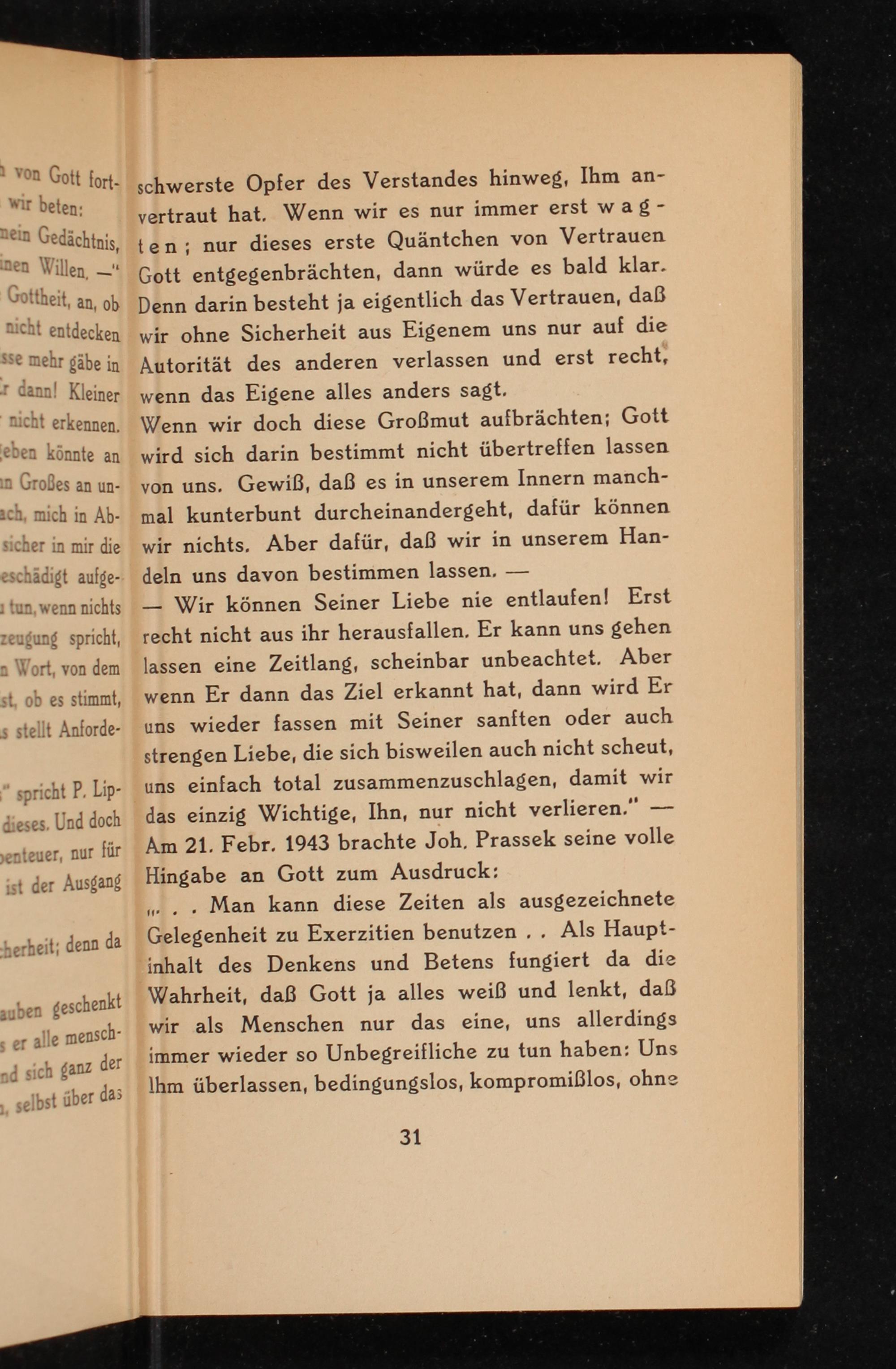 _ Wir können Seiner Liebe nie entlaufen! Erst recht nicht aus ihr herausfallen. Er kann uns gehen lassen eine Zeitlang, scheinbar unbeachtet. Aber wenn Er dann das Ziel erkannt hat, dann wird Er uns wieder fassen mit Seiner sanften oder auch strengen Liebe, die sich bisweilen auch nicht scheut, uns einfach total zusammenzuschlagen, damit wir das einzig Wichtige, Ihn, nur nicht verlieren.”— Am 21. Febr. 1943 brachte Joh, Prassek seine volle Hingabe an Gott zum Ausdruck: