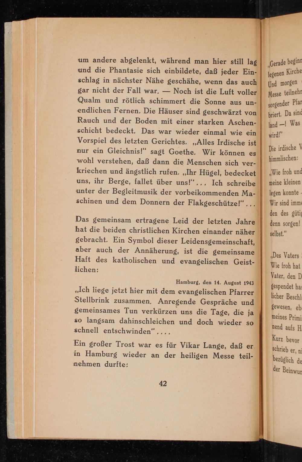 Hamburg , den 14. August 1943 ,, Ich liege jetzt hier mit dem evangelischen Pfarrer Stellbrink zusammen. Anregende Gespräche und gemeinsames Tun verkürzen uns die Tage, die ja so langsam dahinschleichen und doch wieder so schnell entschwinden"....