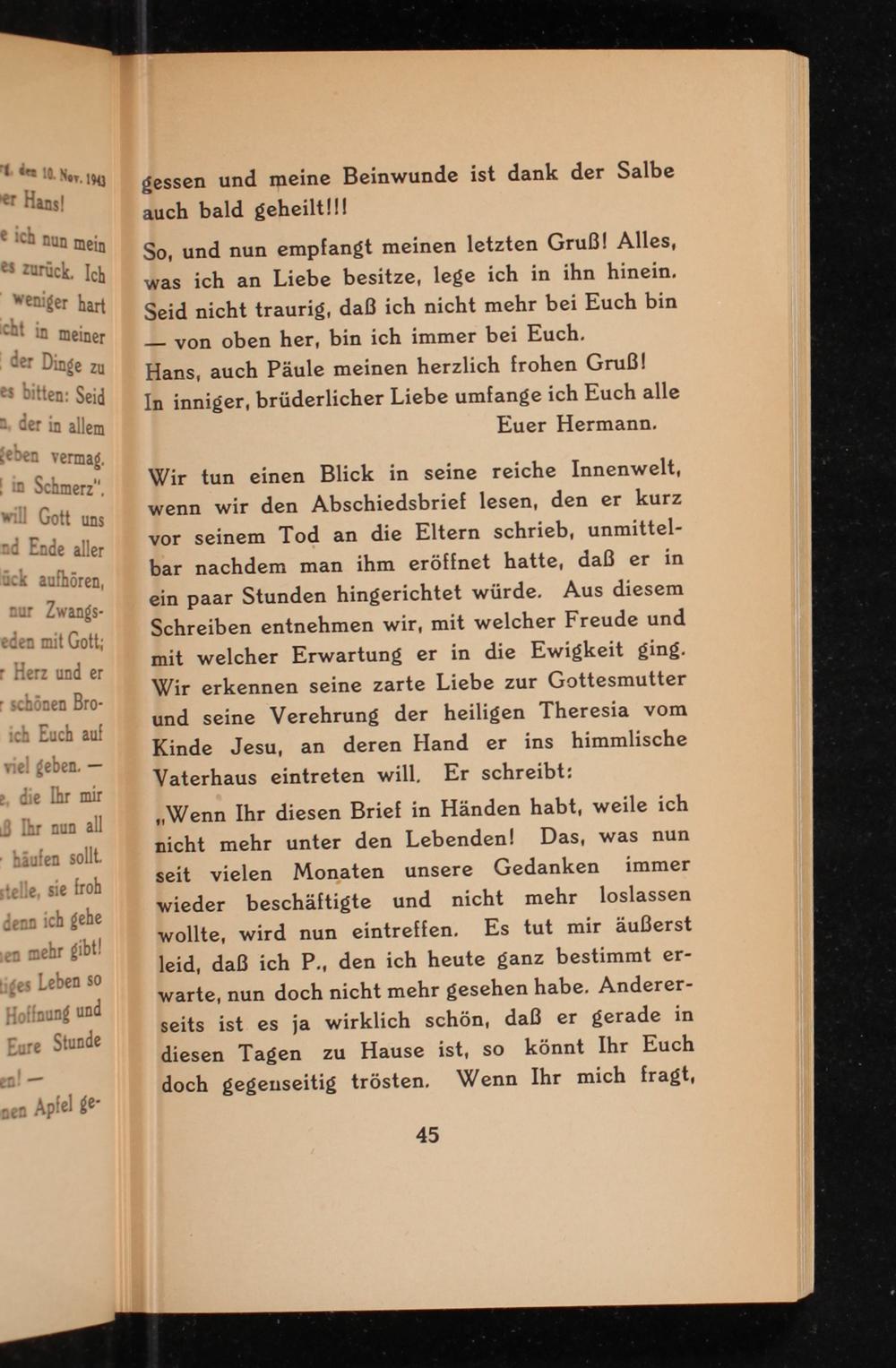 Wir tun einen Blick in seine reiche Innenwelt, wenn wir den Abschiedsbrief lesen, den er kurz vor seinem Tod an die Eltern schrieb, unmittelbar nachdem man ihm eröffnet hatte, daß er in ein paar Stunden hingerichtet würde. Aus diesem Schreiben entnehmen wir, mit welcher Freude und mit welcher Erwartung er in die Ewigkeit ging. Wir erkennen seine zarte Liebe zur Gottesmutter und seine Verehrung der heiligen Theresia vom Kinde Jesu , an deren Hand er ins himmlische Vaterhaus eintreten will, Er schreibt: