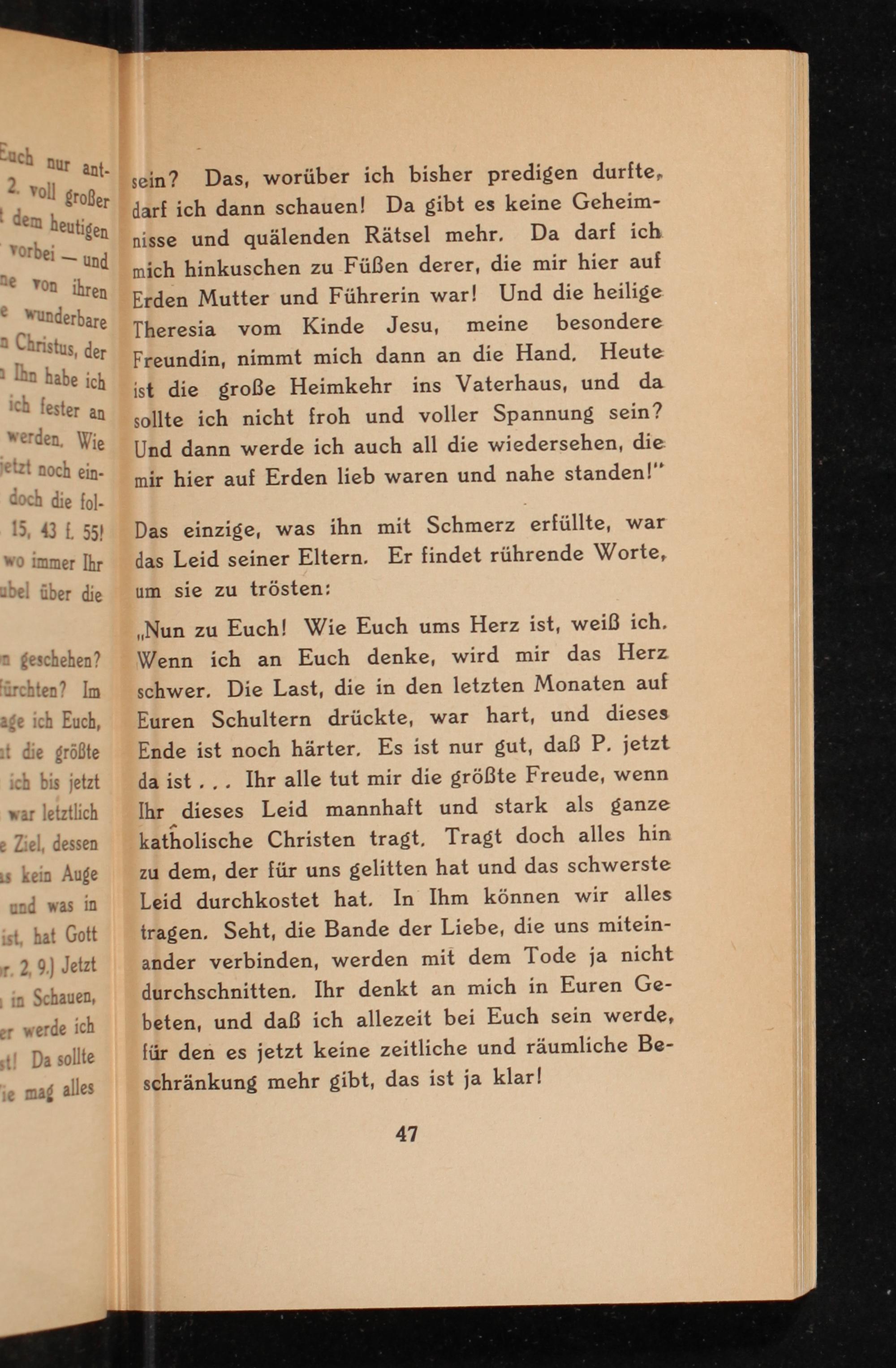 ,, Nun zu Euch! Wie Euch ums Herz ist, weiß ich. Wenn ich an Euch denke, wird mir das Herz schwer. Die Last, die in den letzten Monaten auf Euren Schultern drückte, war hart, und dieses Ende ist noch härter. Es ist nur gut, daß P. jetzt da ist... Ihr alle tut mir die größte Freude, wenn Ihr dieses Leid mannhaft und stark als ganze katholische Christen tragt. Tragt doch alles hin zu dem, der für uns gelitten hat und das schwerste Leid durchkostet hat. In Ihm können wir alles tragen. Seht, die Bande der Liebe, die uns miteinander verbinden, werden mit dem Tode ja nicht durchschnitten. Ihr denkt an mich in Euren Gebeten, und daß ich allezeit bei Euch sein werde, für den es jetzt keine zeitliche und räumliche Beschränkung mehr gibt, das ist ja klar!