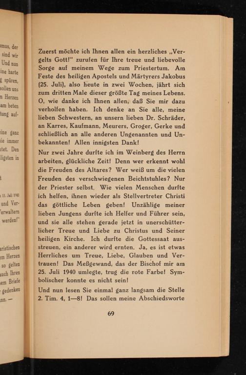 Zuerst möchte ich Ihnen allen ein herzliches ,, Vergelts Gott !" zurufen für Ihre treue und liebevolle Sorge auf meinem Wege zum Priestertum. Am Feste des heiligen Apostels und Märtyrers Jakobus ( 25. Juli), also heute in zwei Wochen, jährt sich zum dritten Male dieser größte Tag meines Lebens. O, wie danke ich Ihnen allen, daß Sie mir dazu verholfen haben. Ich denke an Sie alle, meine lieben Schwestern, an unsern lieben Dr. Schräder, an Karres, Kaufmann, Meurers, Groger, Gerke und schließlich an alle anderen Ungenannten und Unbekannten! Allen innigsten Dank!