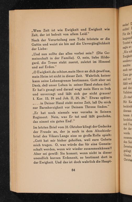 Im letzten Brief vom 31. Oktober klingt der Gedanke der Freude an, der ja auch in dem Abschiedsbrief des Vikars Lange eine so große Rolle spielt: ,, Gott hat mir bisher geholfen, weil eure Gebete mich trugen. O, was würde das für eine Gemeinschaft werden, wenn wir wieder zusammenkämen!! Aber sei gewiß: Sie kommt; wenn nicht in dieser unendlich kurzen Erdenzeit, so bestimmt dort in der Ewigkeit. Und das ist doch wahrlich die Haupt