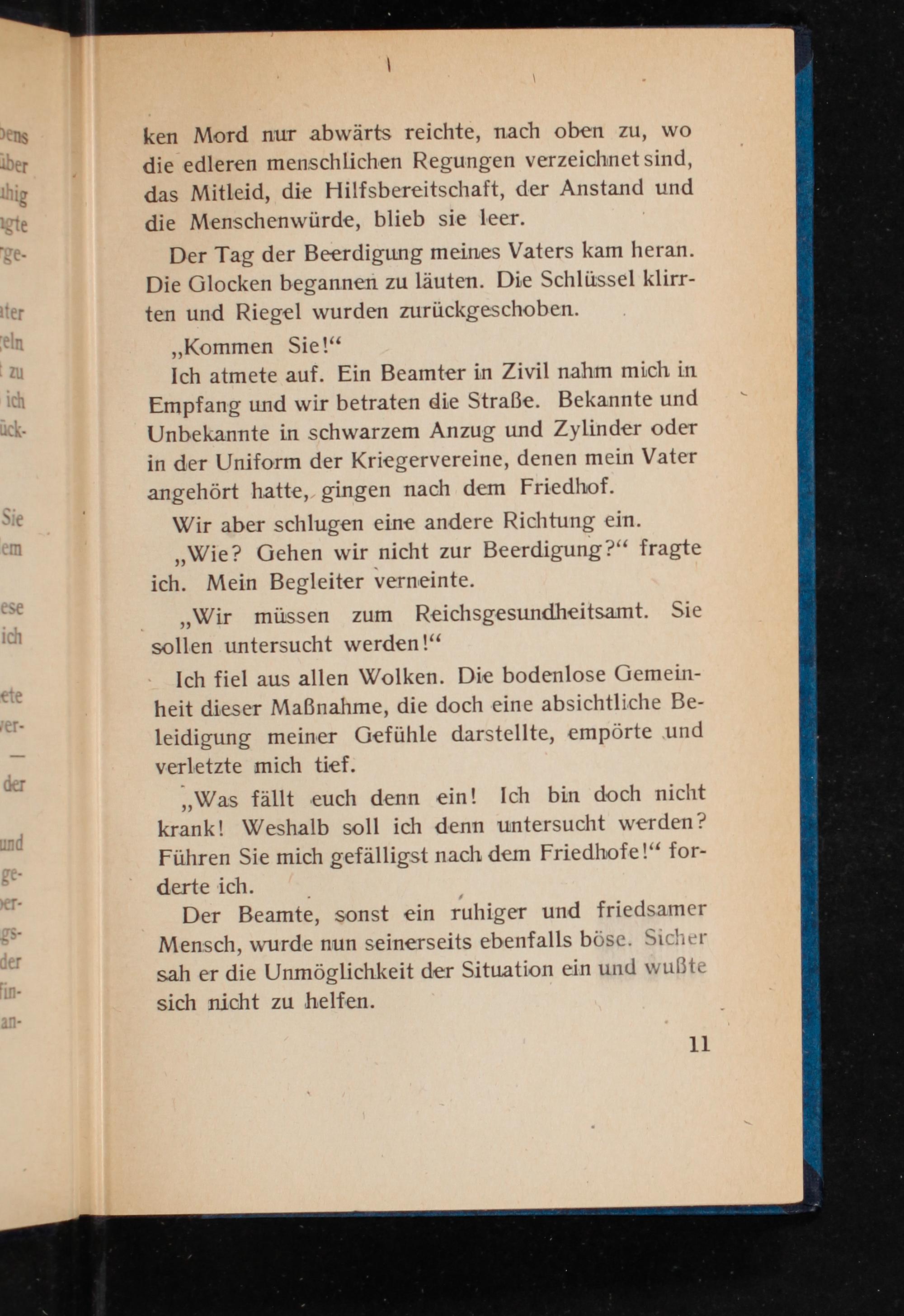 Ich atmete auf. Ein Beamter in Zivil nahm mich in Empfang und wir betraten die Straße. Bekannte und Unbekannte in schwarzem Anzug und Zylinder oder in der Uniform der Kriegervereine, denen mein Vater angehört hatte, gingen nach dem Friedhof.