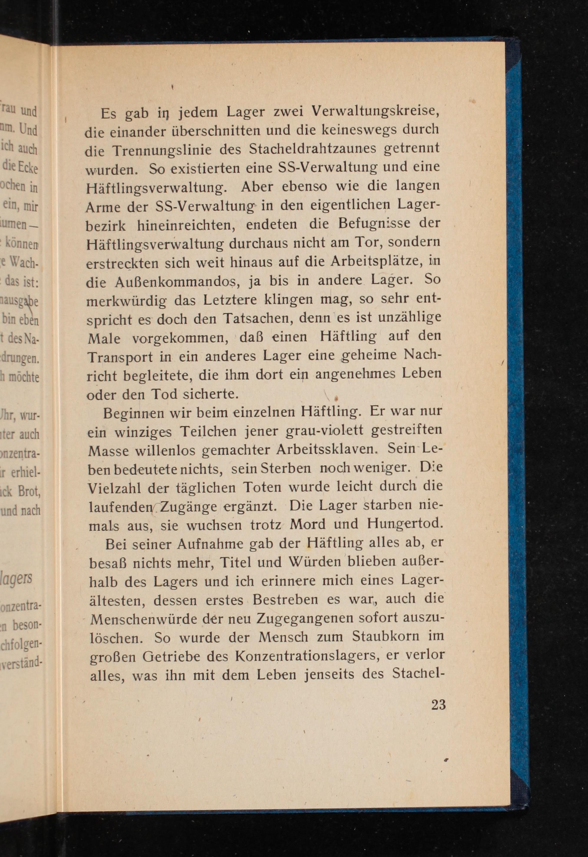 Bei seiner Aufnahme gab der Häftling alles ab, er besaß nichts mehr, Titel und Würden blieben außer- halb des Lagers und ich erinnere mich eines Lager- ältesten, dessen erstes Bestreben es war, auch die Menschenwürde der neu Zugegangenen sofort auszu- löschen. So wurde der Mensch zum Staubkorn im großen Getriebe des Konzentrationslagers, er verlor alles, was ihn mit dem Leben jenseits des Stachel-