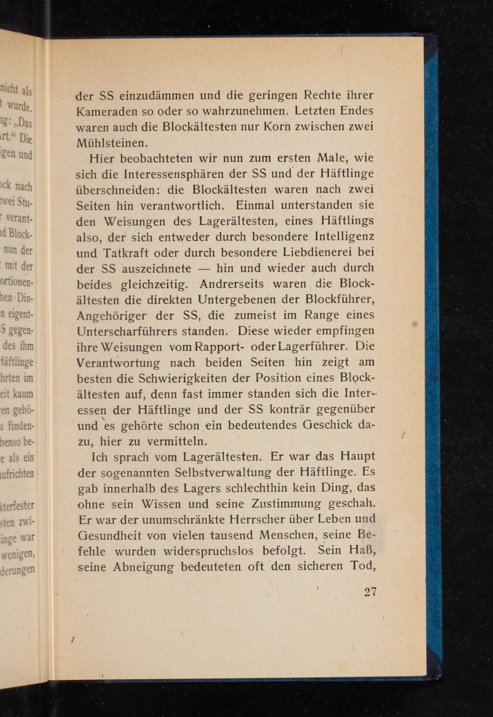 der SS einzudämmen und die geringen Rechte ihrer Kameraden so oder so wahrzunehmen. Letzten Endes waren auch die Blockältesten nur Korn zwischen zwei Mühlsteinen.
