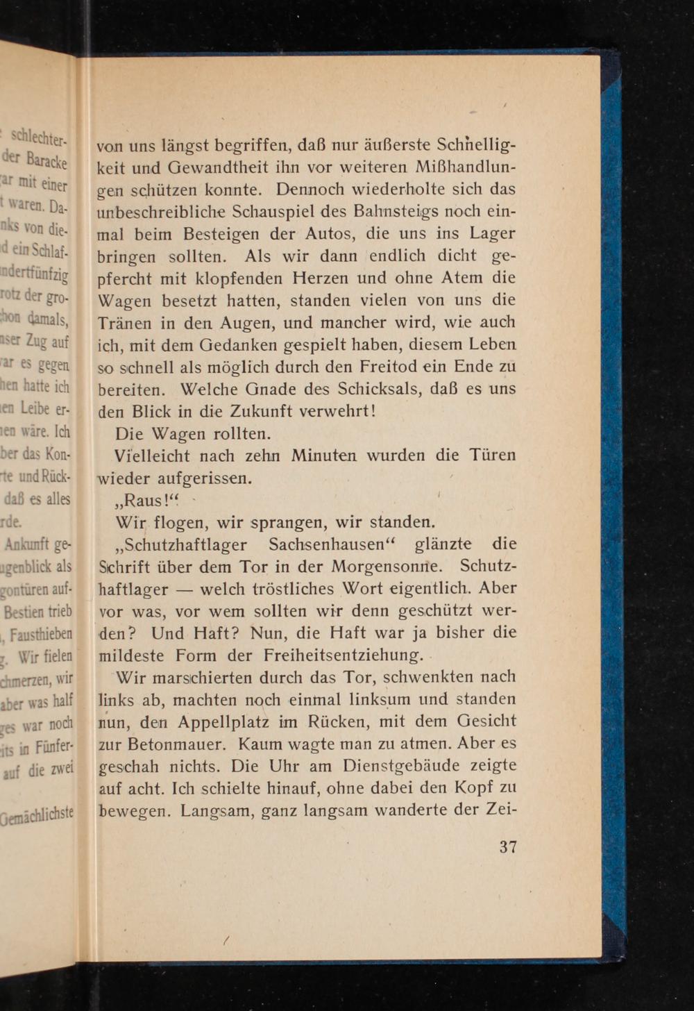 „Schutzhaftlager Sachsenhausen‘ glänzte die Schrift über dem Tor in der Morgensonrie. Schutz- haftlager— welch tröstliches Wort eigentlich. Aber vor was, vor wem sollten wir denn geschützt wer- den? Und Haft? Nun, die Haft war ja bisher die mildeste Form der Freiheitsentziehung.