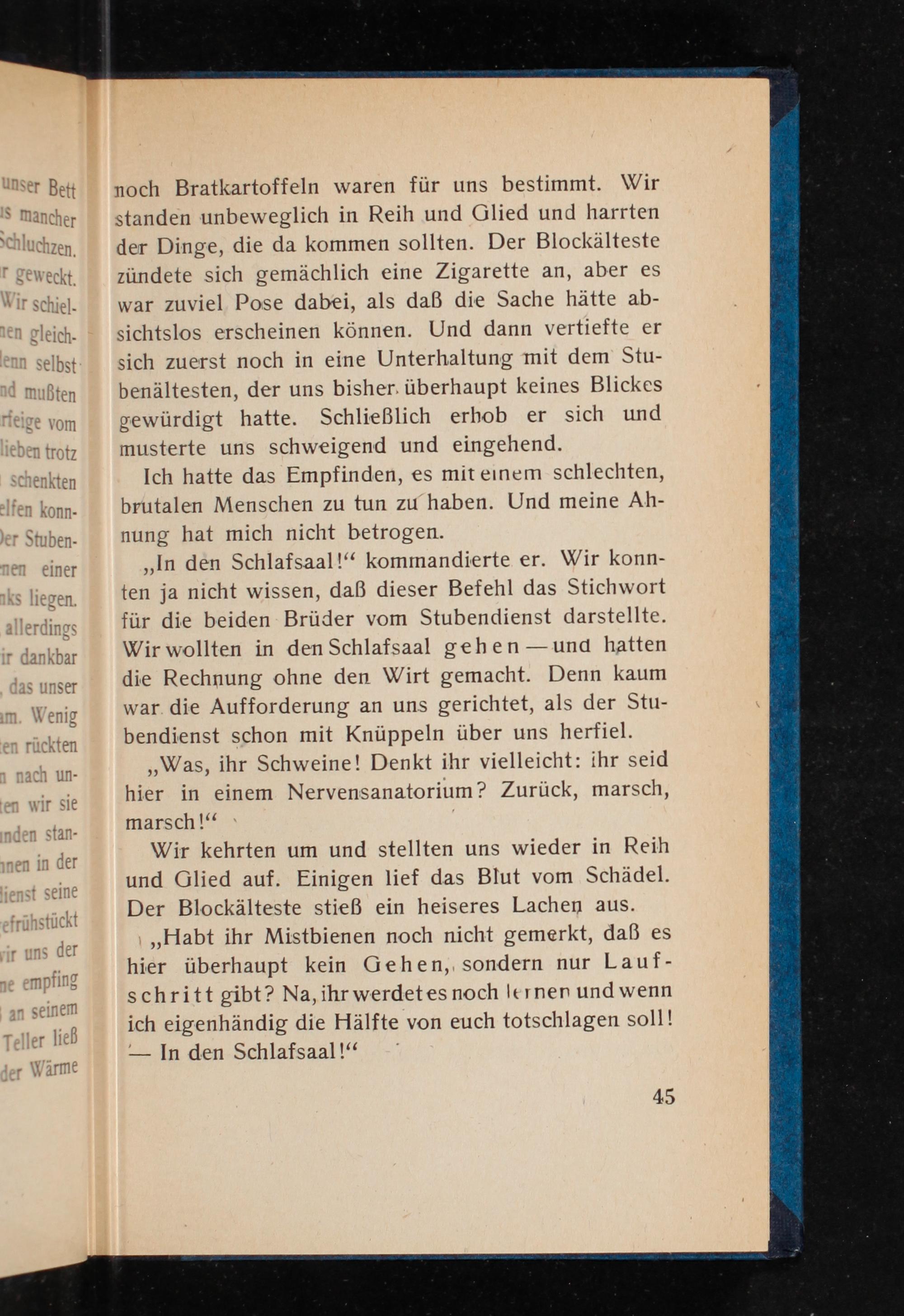 „Was, ihr Schweine! Denkt ihr vielleicht: ihr seid hier in einem Nervensanatorium? Zurück, marsch, marsch!“