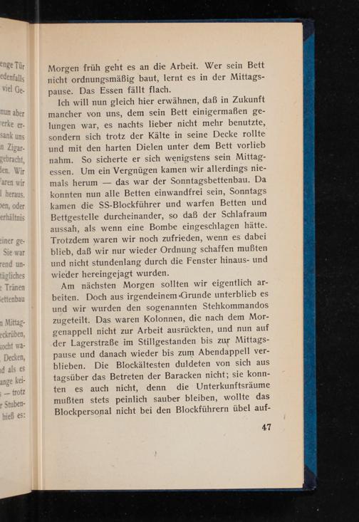 Ich will nun gleich hier erwähnen, daß in Zukunft mancher von uns, dem sein Bett einigermaßen ge- lungen war, es nachts lieber nicht mehr benutzte, sondern sich trotz der Kälte in seine Decke rollte und mit den harten Dielen unter dem Bett vorlieb nahm. So sicherte er sich wenigstens sein Mittag- essen. Um ein Vergnügen kamen wir allerdings nie- mals herum— das war der Sonntagsbettenbau. Da konnten nun alle Betten einwandfrei sein, Sonntags kamen die SS -Blockführer und warfen Betten und Bettgestelle durcheinander, so daß der Schlafraum aussah, als wenn eine Bombe eingeschlagen hätte. Trotzdem waren wir noch zufrieden, wenn es dabei blieb, daß wir nur wieder Ordnung schaffen mußten und nicht stundenlang durch die Fenster hinaus- und wieder hereingejagt wurden.