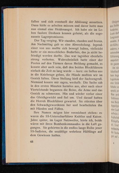 Ihre Namen mögen hier verzeichnet stehen: es waren die SS- Unterscharführer Knittler und Kaiser. Jahre später, im Lager Natzweiler , hörte ich, beide wären mit ihren Bombenkommandos in die Luft gegangen. Sie gehörten in die endlos lange Reihe jener SS- Sadisten, die unzählige wehrlose Häftlinge auf dem Gewissen hatten.