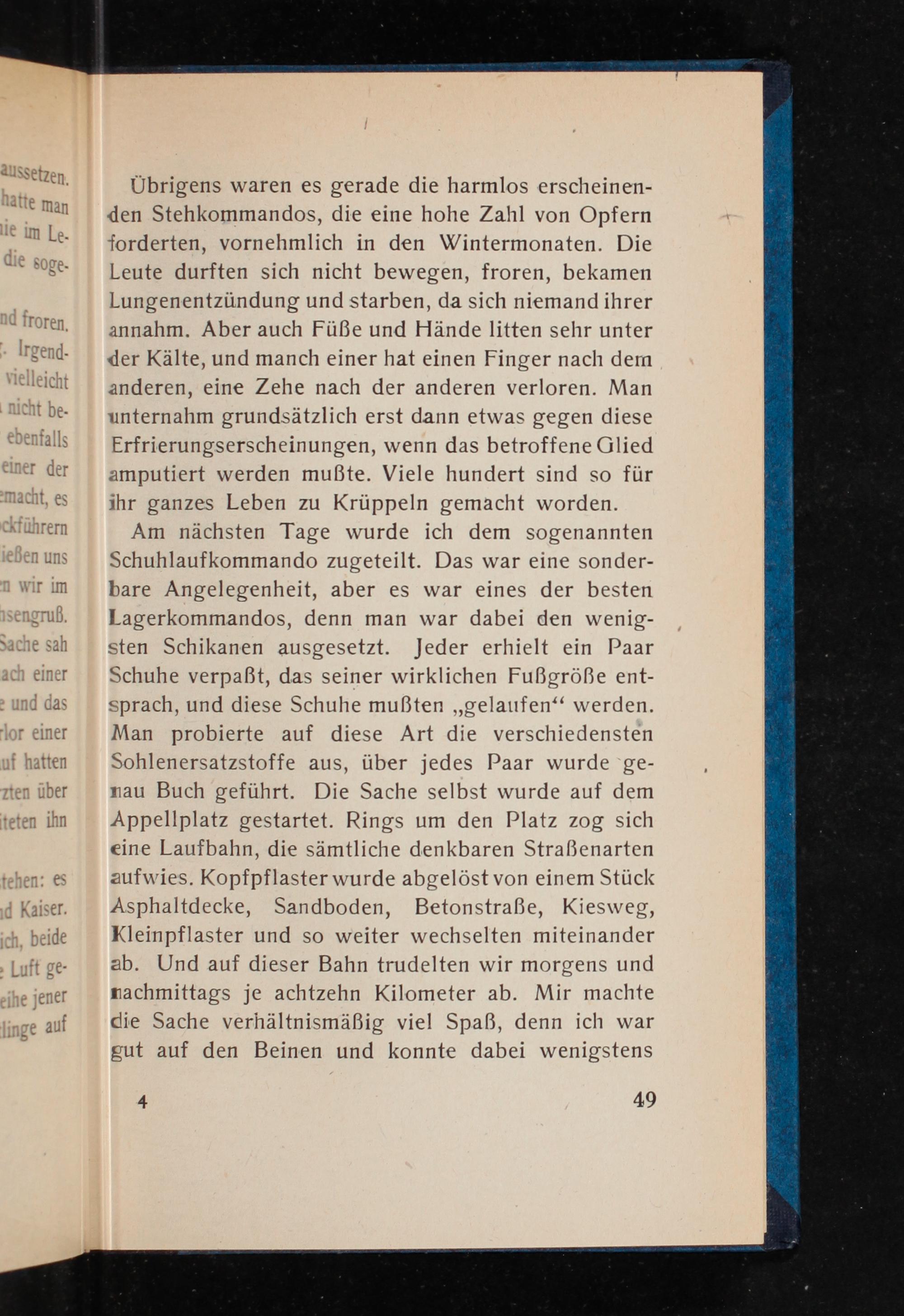 Übrigens waren es gerade die harmlos erscheinen- den Stehkommandos, die eine hohe Zahl von Opfern forderten, vornehmlich in den Wintermonaten. Die Leute durften sich nicht bewegen, froren, bekamen Lungenentzündung und starben, da sich niemand ihrer annahm. Aber auch Füße und Hände litten sehr unter der Kälte, und manch einer hat einen Finger nach dem anderen, eine Zehe nach der anderen verloren. Man unternahm grundsätzlich erst dann etwas gegen diese Erfrierungserscheinungen, wenn das betroffene Glied amputiert werden mußte. Viele hundert sind so für ihr ganzes Leben zu Krüppeln gemacht worden.