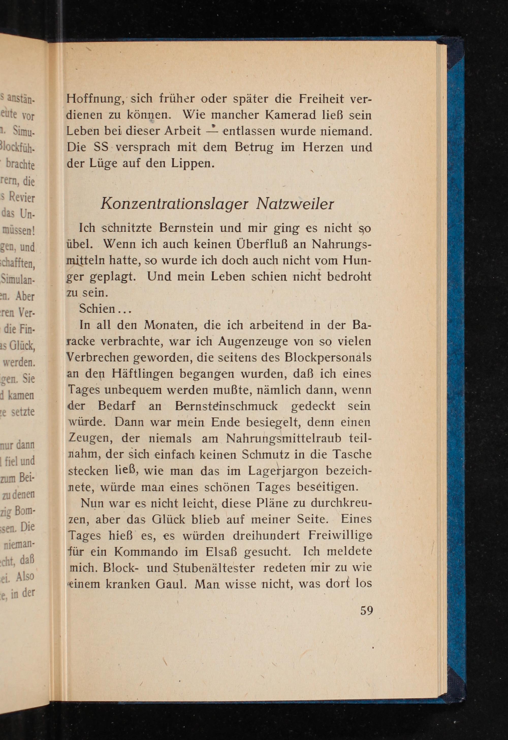 Nun war es nicht leicht, diese Pläne zu durchkreuzen, aber das Glück blieb auf meiner Seite. Eines Tages hieß es, es würden dreihundert Freiwillige für ein Kommando im Elsaß gesucht. Ich meldete mich. Block- und Stubenältester redeten mir zu wie einem kranken Gaul. Man wisse nicht, was dort los