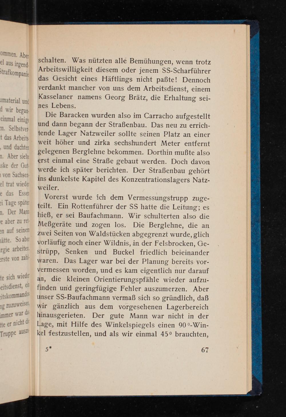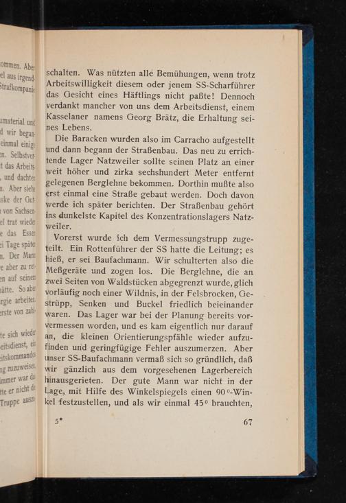 das Gesicht eines Häftlings nicht paßte! Dennoch verdankt mancher von uns dem Arbeitsdienst, einem Kasselaner namens Georg Brätz, die Erhaltung seines Lebens.