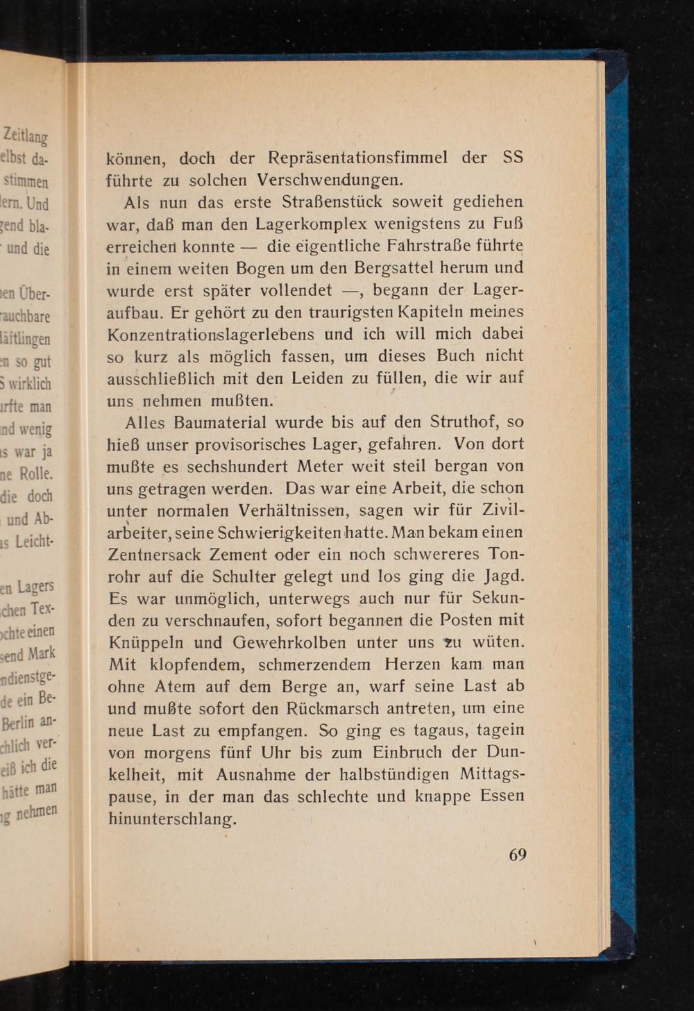 Alles Baumaterial wurde bis auf den Struthof, so hieß unser provisorisches Lager, gefahren. Von dort mußte es sechshundert Meter weit steil bergan von uns getragen werden. Das war eine Arbeit, die schon unter normalen Verhältnissen, sagen wir für Zivil- arbeiter, seine Schwierigkeiten hatte. Man bekam einen Zentnersack Zement oder ein noch schwereres Ton- rohr auf die Schulter gelegt und los ging die Jagd. Es war unmöglich, unterwegs auch nur für Sekun- den zu verschnaufen, sofort begannen die Posten mit Knüppeln und Gewehrkolben unter uns zu wüten. Mit klopfendem, schmerzendem Herzen kam man ohne Atem auf dem Berge an, warf seine Last ab und mußte sofort den Rückmarsch antreten, um eine neue Last zu empfangen. So ging es tagaus, tagein von morgens fünf Uhr bis zum Einbruch der Dun- kelheit, mit Ausnahme der halbstündigen Mittags- pause, in der man das schlechte und knappe Essen hinunterschlang.
