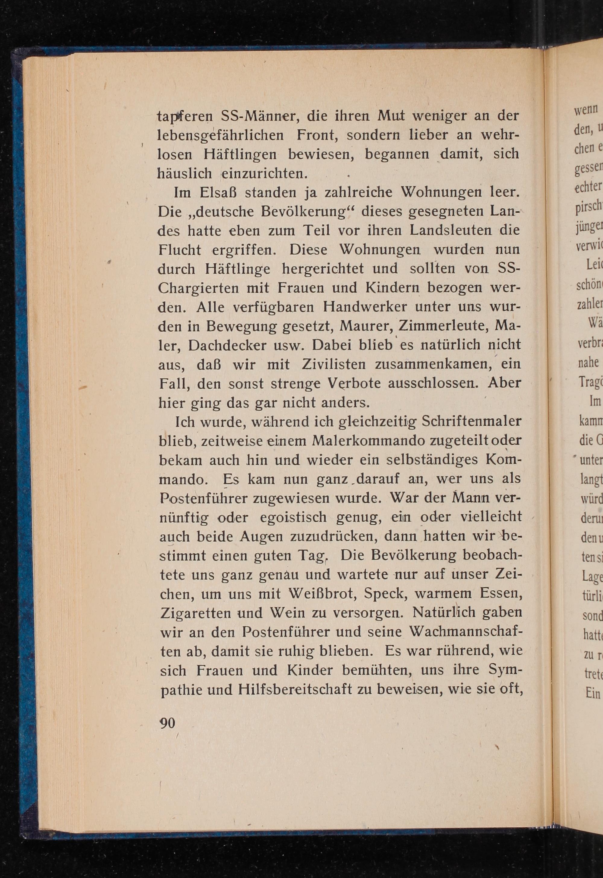 Im Elsaß standen ja zahlreiche Wohnungen leer. Die ,, deutsche Bevölkerung" dieses gesegneten Landes hatte eben zum Teil vor ihren Landsleuten die Flucht ergriffen. Diese Wohnungen wurden nun durch Häftlinge hergerichtet und sollten von SSChargierten mit Frauen und Kindern bezogen werden. Alle verfügbaren Handwerker unter uns wurden in Bewegung gesetzt, Maurer, Zimmerleute, Maler, Dachdecker usw. Dabei blieb es natürlich nicht aus, daß wir mit Zivilisten zusammenkamen, ein Fall, den sonst strenge Verbote ausschlossen. Aber hier ging das gar nicht anders.