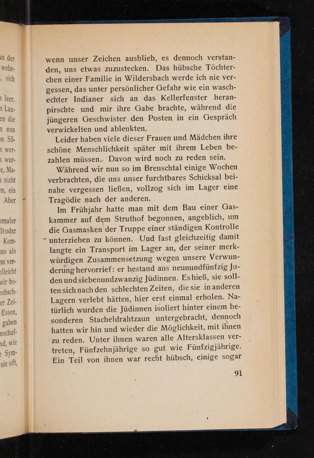 Im Frühjahr hatte man mit dem Bau einer Gas- ımaler kammer auf dem Struthof begonnen, angeblich, um Itoder die Gasmasken der Truppe einer ständigen Kontrolle Kom-- unterziehen zu können. Und fast gleichzeitig damit ns als langte. ein Transport im Lager an, der seiner merk- In Ver- würdigen Zusammensetzung wegen unsere Verwun- leicht} derunghervorrief: er bestand aus neunundfünfzig Ju- wir be- den und siebenundzwanzig Jüdinnen. Eshieß, sie soll- :obach- tensichnachden schlechten Zeiten, die sie inanderen er Zei- Lagern verlebt hätten, hier erst einmal erholen. Na- Essen,} türlich wurden die Jüdinnen isoliert hinter einem be- gaben} sonderen Stacheldrahtzaun untergebracht, dennoch nschaf- hatten wir hin und wieder die Möglichkeit, mit ihnen 1d, wie I zu reden. Unter ihnen waren alle Altersklassen ver- - treten, Fünfzehnjährige so gut wie Fünfzigjährige. sie’oft, Ein Teil von ihnen war recht hübsch, einige sogar