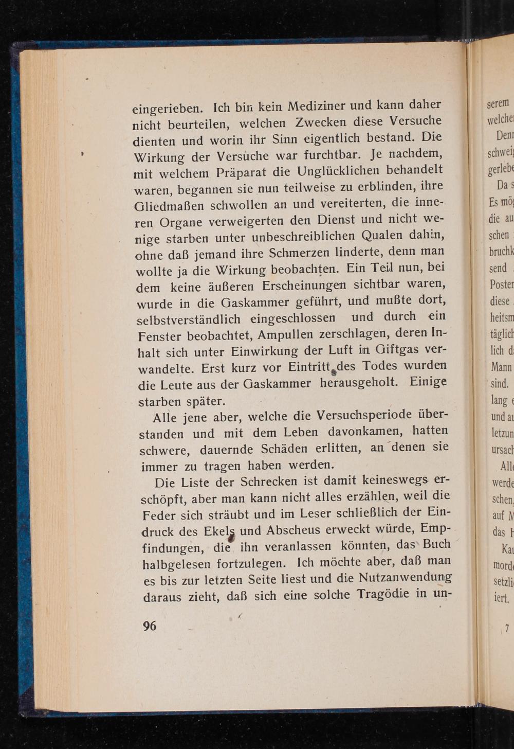 eingerieben. Ich bin kein Mediziner und kann daher nicht beurteilen, welchen Zwecken diese Versuche dienten und worin ihr Sinn eigentlich bestand. Die Wirkung der Versuche war furchtbar. Je nachdem, mit welchem Präparat die Unglücklichen behandelt waren, begannen sie nun teilweise zu erblinden, ihre Gliedmaßen schwollen an und vereiterten, die inneren Organe verweigerten den Dienst und nicht wenige starben unter unbeschreiblichen Qualen dahin, ohne daß jemand ihre Schmerzen linderte, denn man wollte ja die Wirkung beobachten. Ein Teil nun, bei dem keine äußeren Erscheinungen sichtbar waren, wurde in die Gaskammer geführt, und mußte dort, selbstverständlich eingeschlossen und durch ein Fenster beobachtet, Ampullen zerschlagen, deren Inhalt sich unter Einwirkung der Luft in Giftgas verwandelte. Erst kurz vor Eintritt des Todes wurden die Leute aus der Gaskammer herausgeholt. Einige starben später.