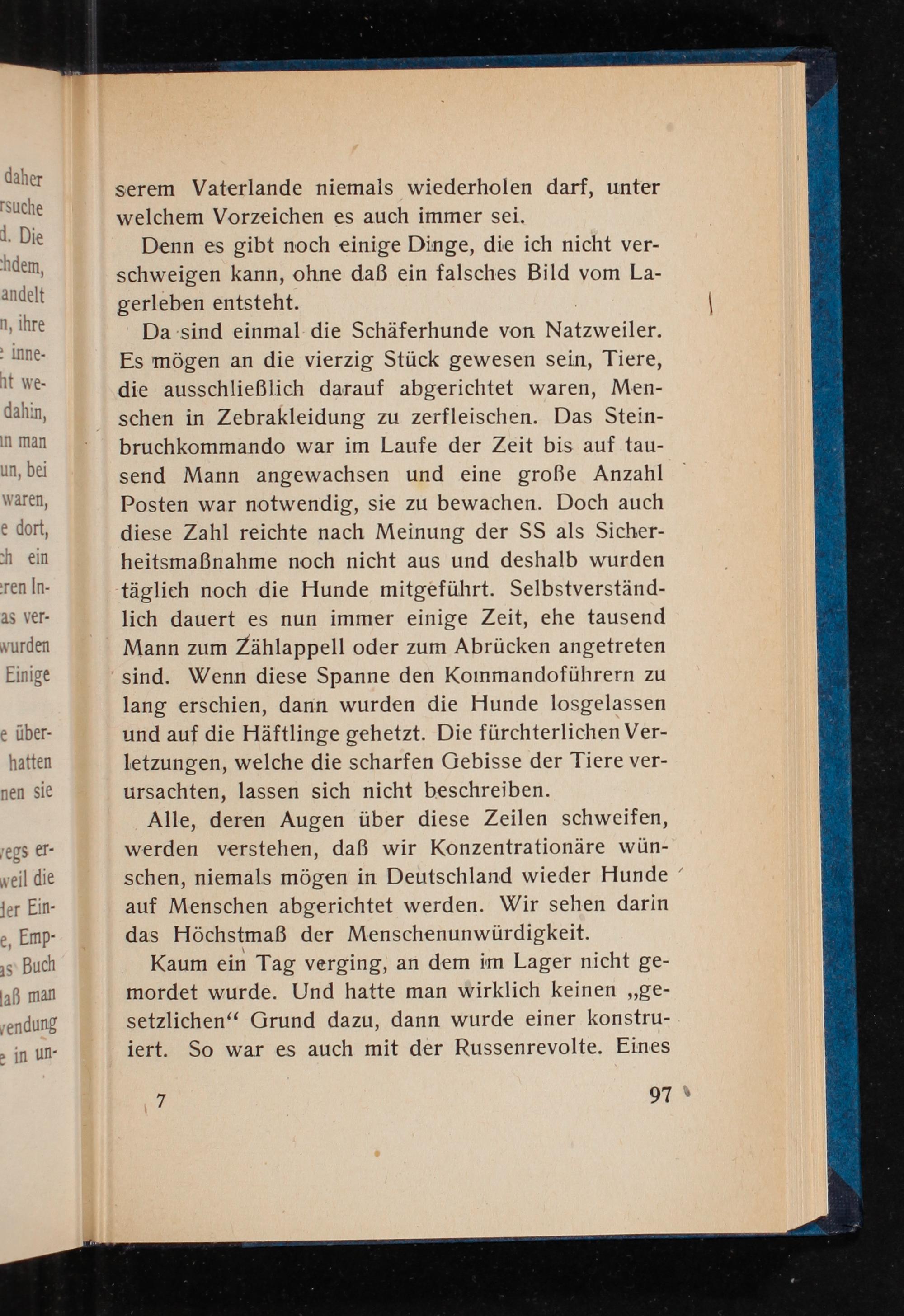 Alle, deren Augen über diese Zeilen schweifen, werden verstehen, daß wir Konzentrationäre wünschen, niemals mögen in Deutschland wieder Hunde auf Menschen abgerichtet werden. Wir sehen darin das Höchstmaß der Menschenunwürdigkeit.