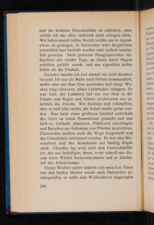 Zunächst machte ich erst einmal ein recht dummes Gesicht. Ich war als Maler nach Pelters kommandiert, muẞte aber mit dem Gros ausrücken und einige Wochen lang schweren, zähen Lehmboden schippen. Es war kalt, der Lehmbrei lief uns von oben in die Schuhe und Regen und Schnee erschwerten uns erheblich das Dasein. Wir fluchten und schimpften, aber es half alles nichts, die Arbeit mußte getan werden. Man hatte einen größeren Gutshof außerhalb des Ortes zu einem Remonteamt gemacht und nun hieß es, Gelände planieren, Pfahlroste einschlagen und Baracken zur Aufnahme von Pferden zu errichten. Dazwischen mußten noch die Wege hergestellt und das Grundstück entwässert werden. Es war eine Riesenarbeit und das Kommando nur fünfzig Köpfe stark. Überdies lag wohl auch dem Unterscharführer, der uns befehligte, daran, recht schnell aus diesem toten Winkel herauszukommen und er drückte auf das Arbeitstempo.