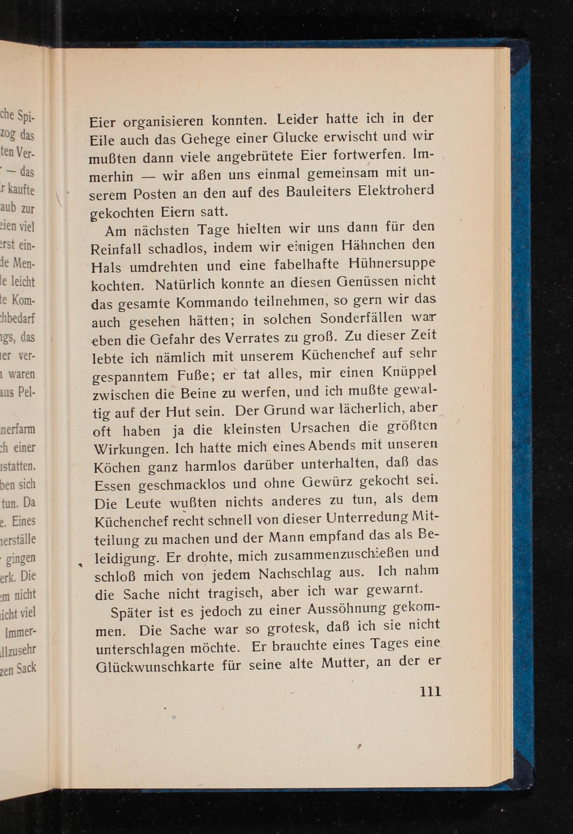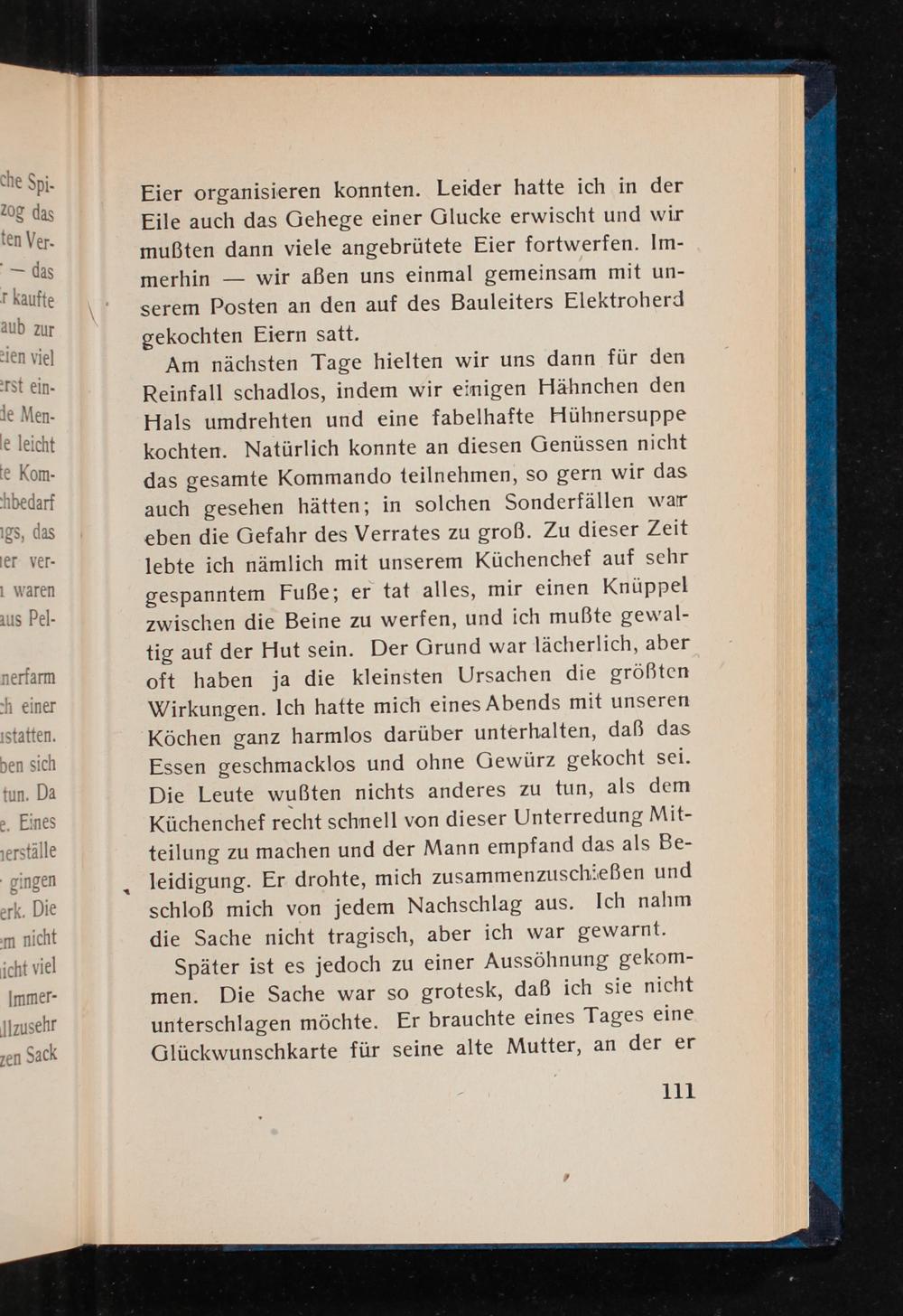 Am nächsten Tage hielten wir uns dann für den Reinfall schadlos, indem wir einigen Hähnchen den Hals umdrehten und eine fabelhafte Hühnersuppe kochten. Natürlich konnte an diesen Genüssen nicht das gesamte Kommando teilnehmen, so gern wir das auch gesehen hätten; in solchen Sonderfällen war eben die Gefahr des Verrates zu groß. Zu dieser Zeit lebte ich nämlich mit unserem Küchenchef auf sehr gespanntem Fuße; er tat alles, mir einen Knüppel zwischen die Beine zu werfen, und ich mußte gewal- tig auf der Hut sein. Der Grund war lächerlich, aber oft haben ja die kleinsten Ursachen die größten Wirkungen. Ich hatte mich eines Abends mit unseren Köchen ganz harmlos darüber unterhalten, daß das Essen geschmacklos und ohne Gewürz gekocht sei. Die Leute wußten nichts anderes zu tun, als dem Küchenchef recht schnell von dieser Unterredung Mit- teilung zu machen und der Mann empfand das als Be- leidigung. Er drohte, mich zusammenzuschießen und schloß mich von jedem Nachschlag aus. Ich nahm die Sache nicht tragisch, aber ich war gewarnt.