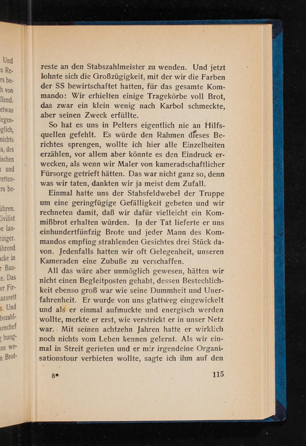 reste an den Stabszahlmeister zu wenden. Und jetzt lohnte sich die Großzügigkeit, mit der wir die Farben der SS bewirtschaftet hatten, für das gesamte Kommando: Wir erhielten einige Tragekörbe voll Brot, das zwar ein klein wenig nach Karbol schmeckte, aber seinen Zweck erfüllte.