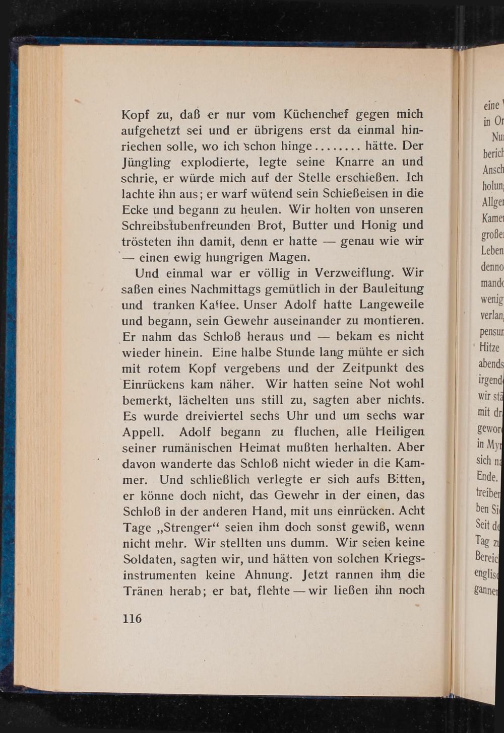 Und einmal war er völlig in Verzweiflung. Wir saßen eines Nachmittags gemütlich in der Bauleitung und tranken Kaffee. Unser Adolf hatte Langeweile und begann, sein Gewehr auseinander zu montieren. Er nahm das Schloß heraus und bekam es nicht wieder hinein. Eine halbe Stunde lang mühte er sich mit rotem Kopf vergebens und der Zeitpunkt des Einrückens kam näher. Wir hatten seine Not wohl bemerkt, lächelten uns still zu, sagten aber nichts. Es wurde dreiviertel sechs Uhr und um sechs war Appell. Adolf begann zu fluchen, alle Heiligen seiner rumänischen Heimat mußten herhalten. Aber davon wanderte das Schloß nicht wieder in die Kammer. Und schließlich verlegte er sich aufs Bitten, er könne doch nicht, das Gewehr in der einen, das Schloß in der anderen Hand, mit uns einrücken. Acht Tage ,, Strenger" seien ihm doch sonst gewiß, wenn nicht mehr. Wir stellten uns dumm. Wir seien keine Soldaten, sagten wir, und hätten von solchen Kriegsinstrumenten keine Ahnung. Jetzt rannen ihm die Tränen herab; er bat, flehte wir ließen ihn noch