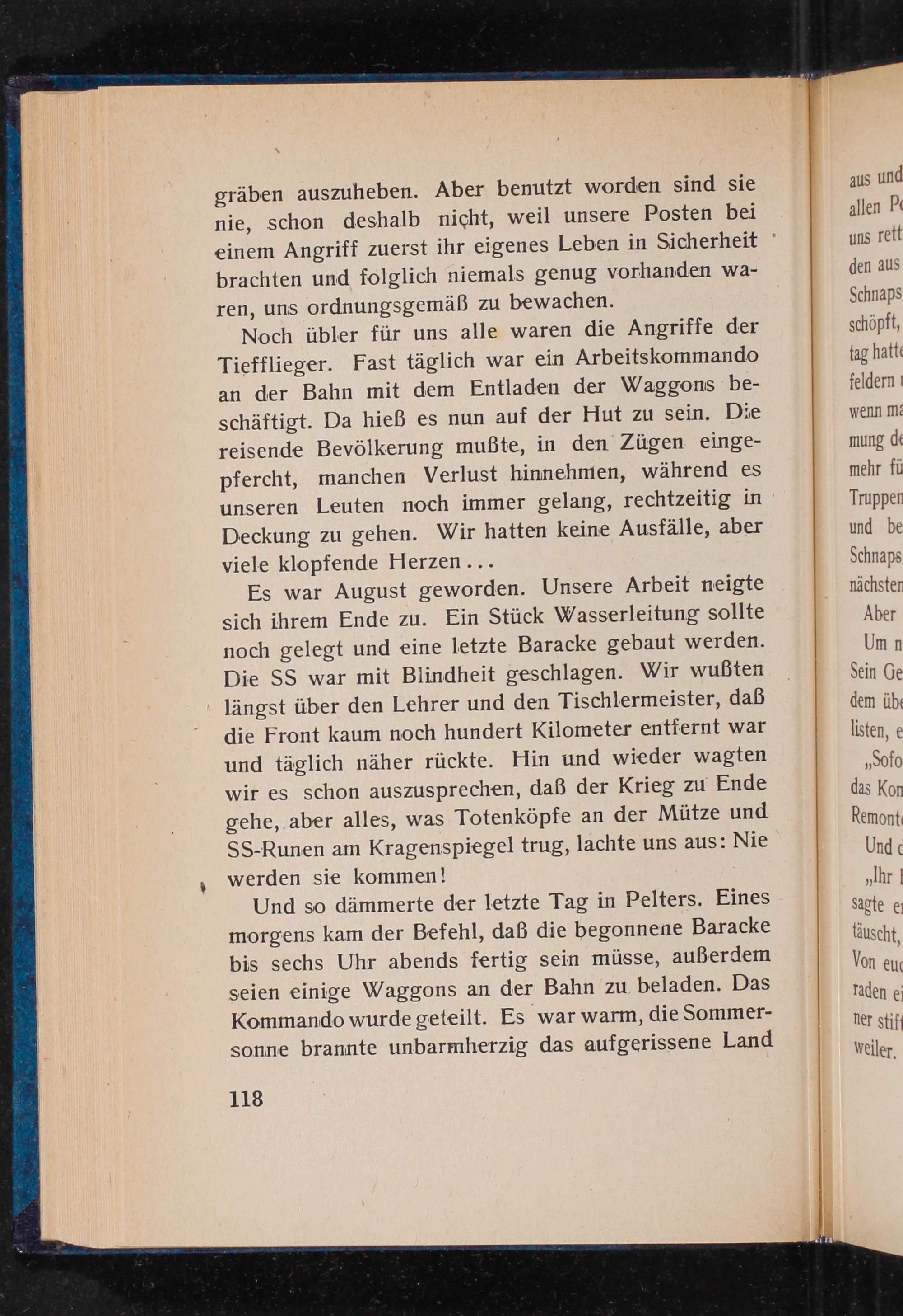 Und so dämmerte der letzte Tag in Pelters. Eines morgens kam der Befehl, daß die begonnene Baracke bis sechs Uhr abends fertig sein müsse, außerdem seien einige Waggons an der Bahn zu beladen. Das Kommando wurde geteilt. Es war warm, die Sommersonne brannte unbarmherzig das aufgerissene Land