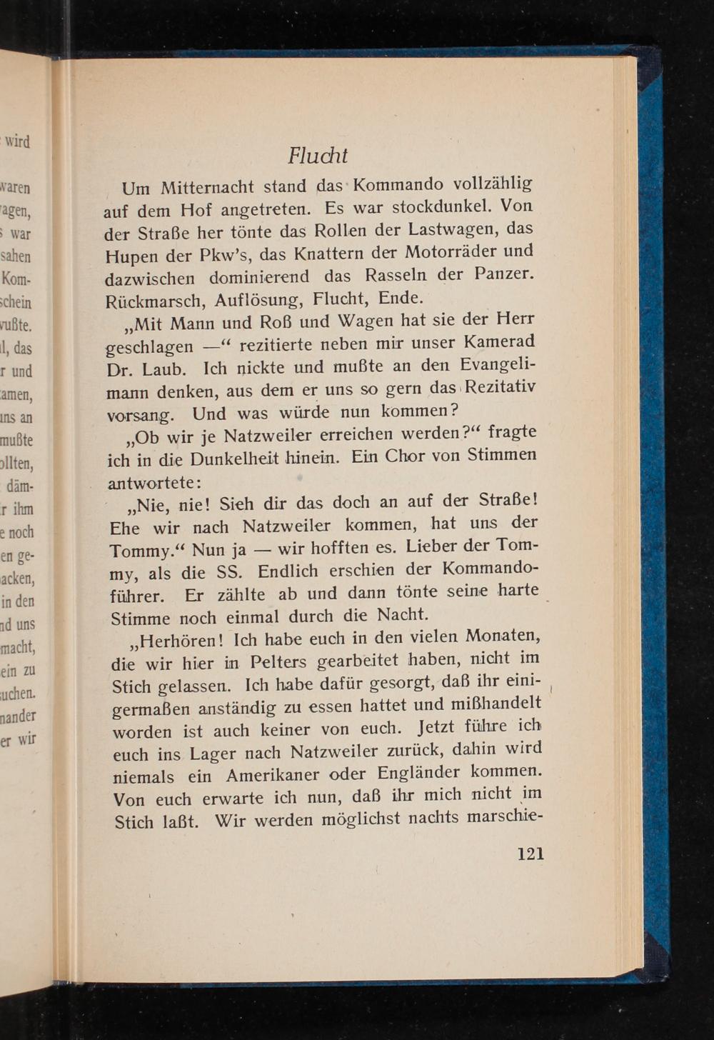 „Herhören! Ich habe euch in den vielen Monaten, die wir hier in Pelters gearbeitet haben, nicht im Stich gelassen. Ich habe dafür gesorgt, daß ihr eini- germaßen anständig zu essen hattet und mißhandelt worden ist auch keiner von euch. Jetzt führe ich euch ins Lager nach Natzweiler zurück, dahin wird niemals ein Amerikaner oder Engländer kommen. Von euch erwarte ich nun, daß ihr mich nicht im Stich laßt. Wir werden möglichst nachts marschie-