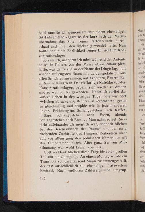 So kam ich, nachdem ich mich während des Aufenthaltes in Pelters von der Masse etwas emanzipiert hatte, was damals ja in der Natur der Dinge lag, nun wieder auf engsten Raum mit Leidensgefährten aus allen Schichten zusammen, mit Arbeitern, Bauern, Beamten und Künstlern. Das vielfarbige Kaleidoskop des Konzentrationslagers begann sich wieder zu drehen und es war bunter geworden. Natürlich verlief das äußere Leben in den wenigen Tagen, die wir dort zwischen Baracke und Windkanal verbrachten, genau so gleichmäßig und stupide wie in jedem anderen Lager. Frühmorgens Schlangestehen nach Kaffee, mittags Schlangestehen nach Essen, abends Schlangestehen nach Brot... Man nahm soviel Rücksicht aufeinander als möglich war, dennoch blieben bei der Beschränktheit des Raumes und der ewig drohenden Zuchtrute des Hungers Reibereien nicht aus, vor allem ging den polnischen Kameraden oft das Temperament durch. Aber ganz frei von Miẞstimmung war wohl, keiner von uns.