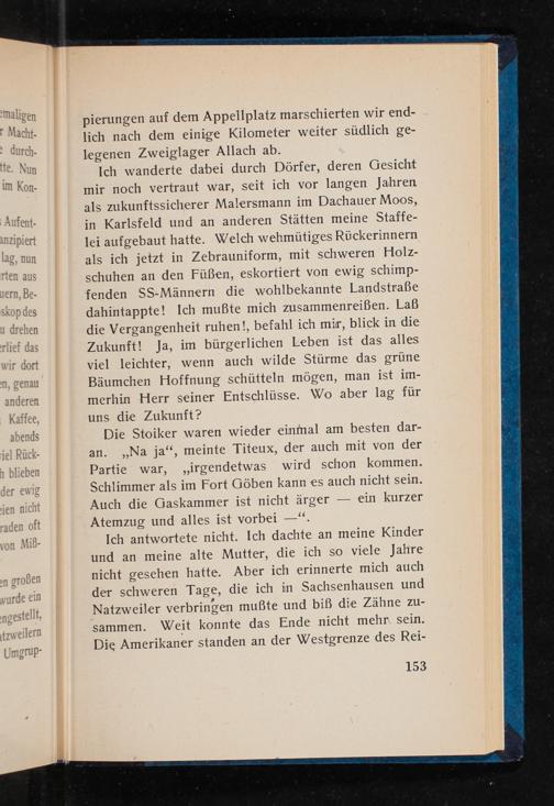 Ich wanderte dabei durch Dörfer, deren Gesicht mir noch vertraut war, seit ich vor langen Jahren. als zukunftssicherer Malersmann im Dachauer Moos, in Karlsfeld und an anderen Stätten meine Staffe- lei aufgebaut hatte. Welch wehmütiges Rückerinnern als ich jetzt in Zebrauniform, mit schweren Holz- schuhen an den Füßen, eskortiert von ewig schimp- fenden SS -Männern die wohlbekannte Landstraße dahintappte! Ich mußte mich zusammenreißen. Laß die Vergangenheit ruhen!, befahl ich mir, blick in die Zukunft! Ja, im bürgerlichen Leben ist das alles viel leichter, wenn auch wilde Stürme das grüne Bäumchen Hoffnung schütteln mögen, man ist im- merhin Herr seiner Entschlüsse. Wo aber lag für uns die Zukunft?