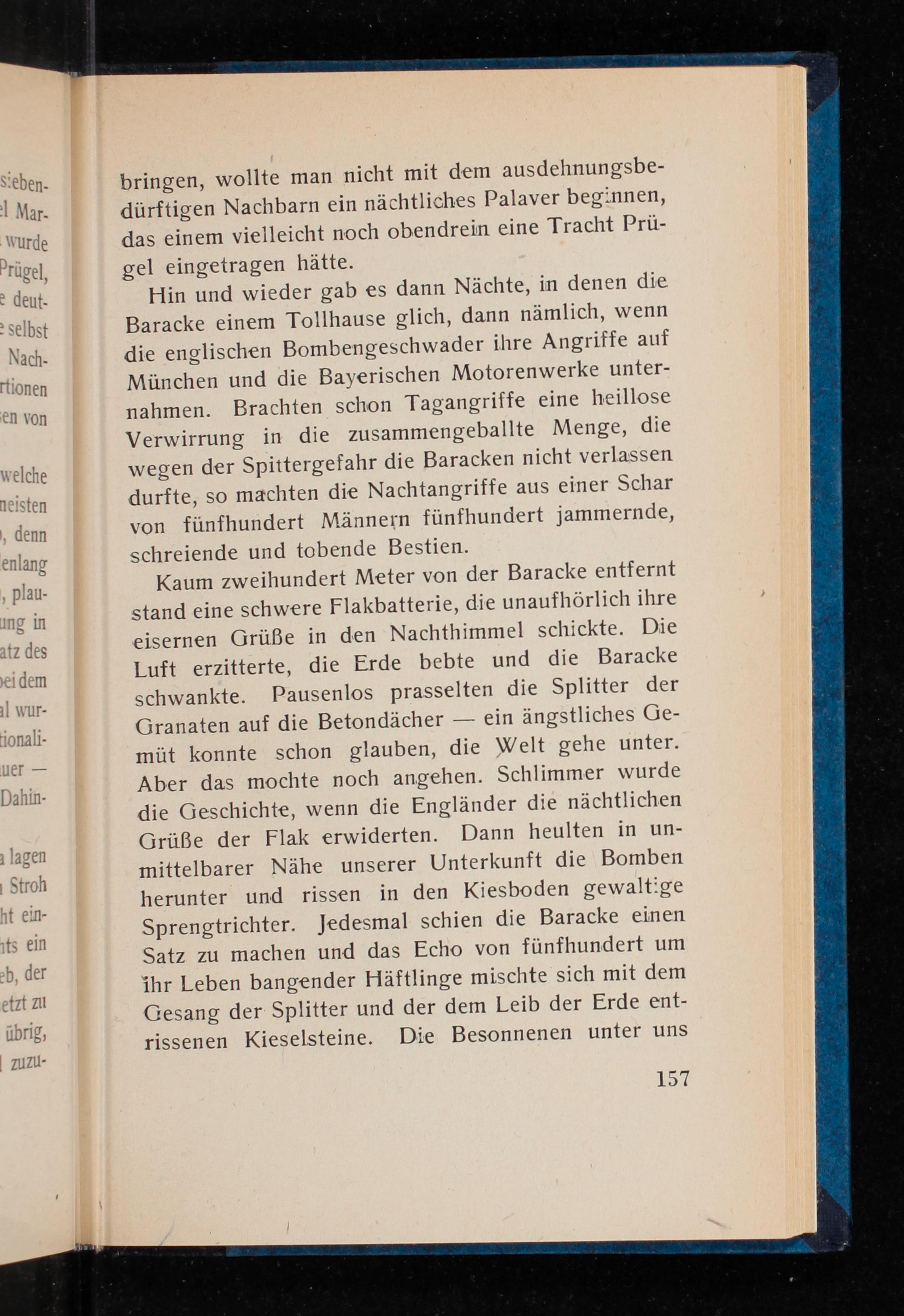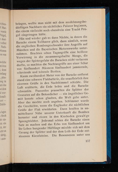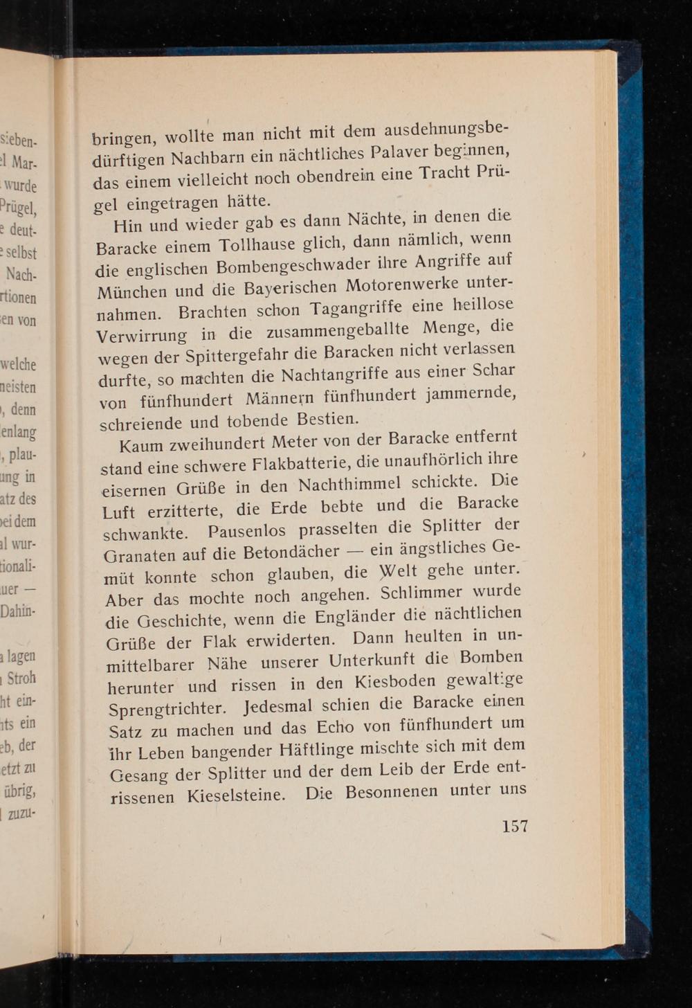 Hin und wieder gab es dann Nächte, in denen die Baracke einem Tollhause glich, dann nämlich, wenn die englischen Bombengeschwader ihre Angriffe auf München und die Bayerischen Motorenwerke unter- nahmen. Brachten schon Tagangriffe eine heillose Verwirrung in die zusammengeballte Menge, die wegen der Spittergefahr die Baracken nicht verlassen durfte, so machten die Nachtangriffe aus einer Schar von fünfhundert Männern fünfhundert jammernde, schreiende und tobende Bestien.