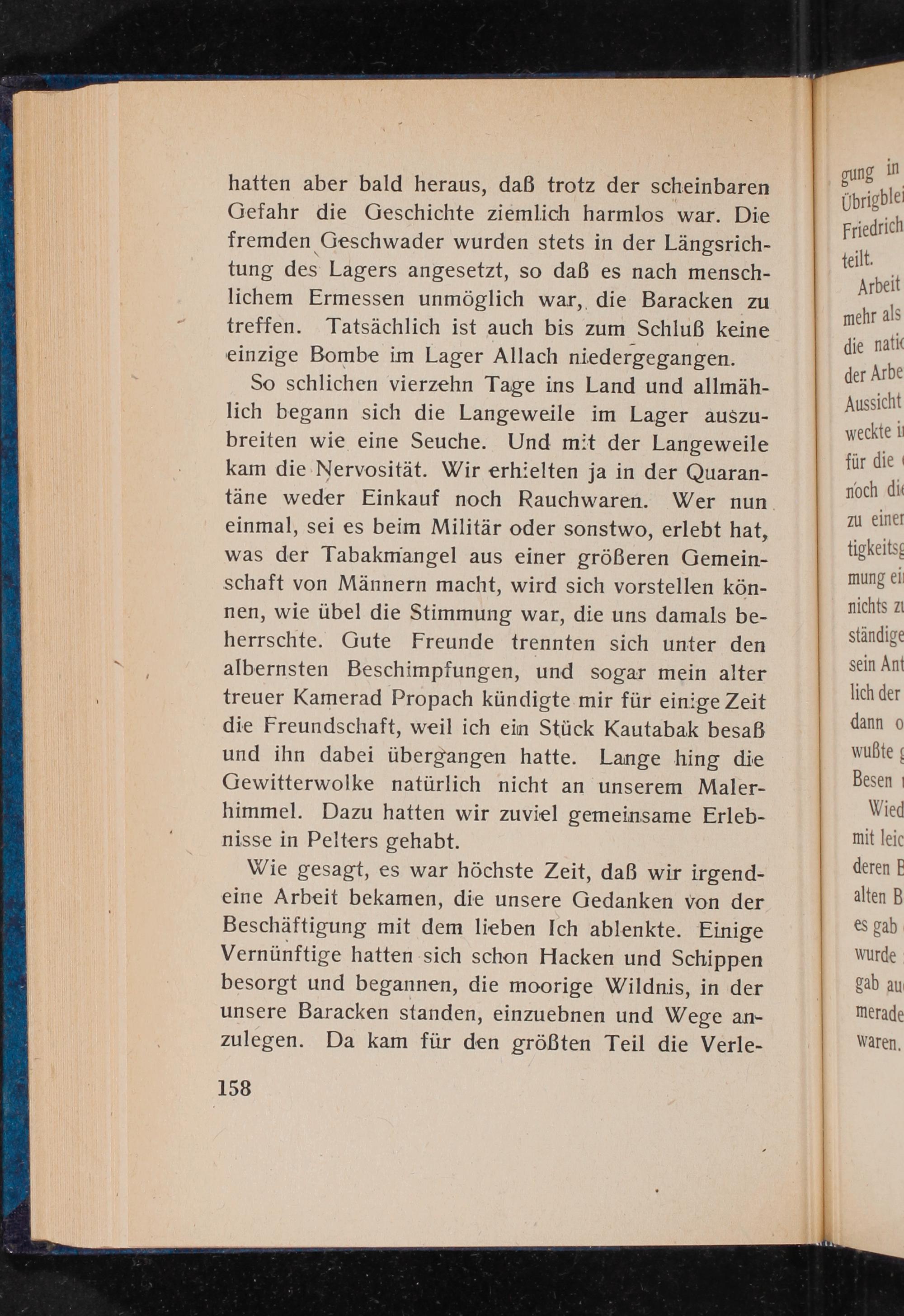 So schlichen vierzehn Tage ins Land und allmählich begann sich die Langeweile im Lager auszubreiten wie eine Seuche. Und mit der Langeweile kam die Nervosität. Wir erhielten ja in der Quarantäne weder Einkauf noch Rauchwaren. Wer nun einmal, sei es beim Militär oder sonstwo, erlebt hat, was der Tabakmangel aus einer größeren Gemeinschaft von Männern macht, wird sich vorstellen können, wie übel die Stimmung war, die uns damals beherrschte. Gute Freunde trennten sich unter den albernsten Beschimpfungen, und sogar mein alter treuer Kamerad Propach kündigte mir für einige Zeit die Freundschaft, weil ich ein Stück Kautabak besaß und ihn dabei übergangen hatte. Lange hing die Gewitterwolke natürlich nicht an unserem Malerhimmel. Dazu hatten wir zuviel gemeinsame Erlebnisse in Pelters gehabt.