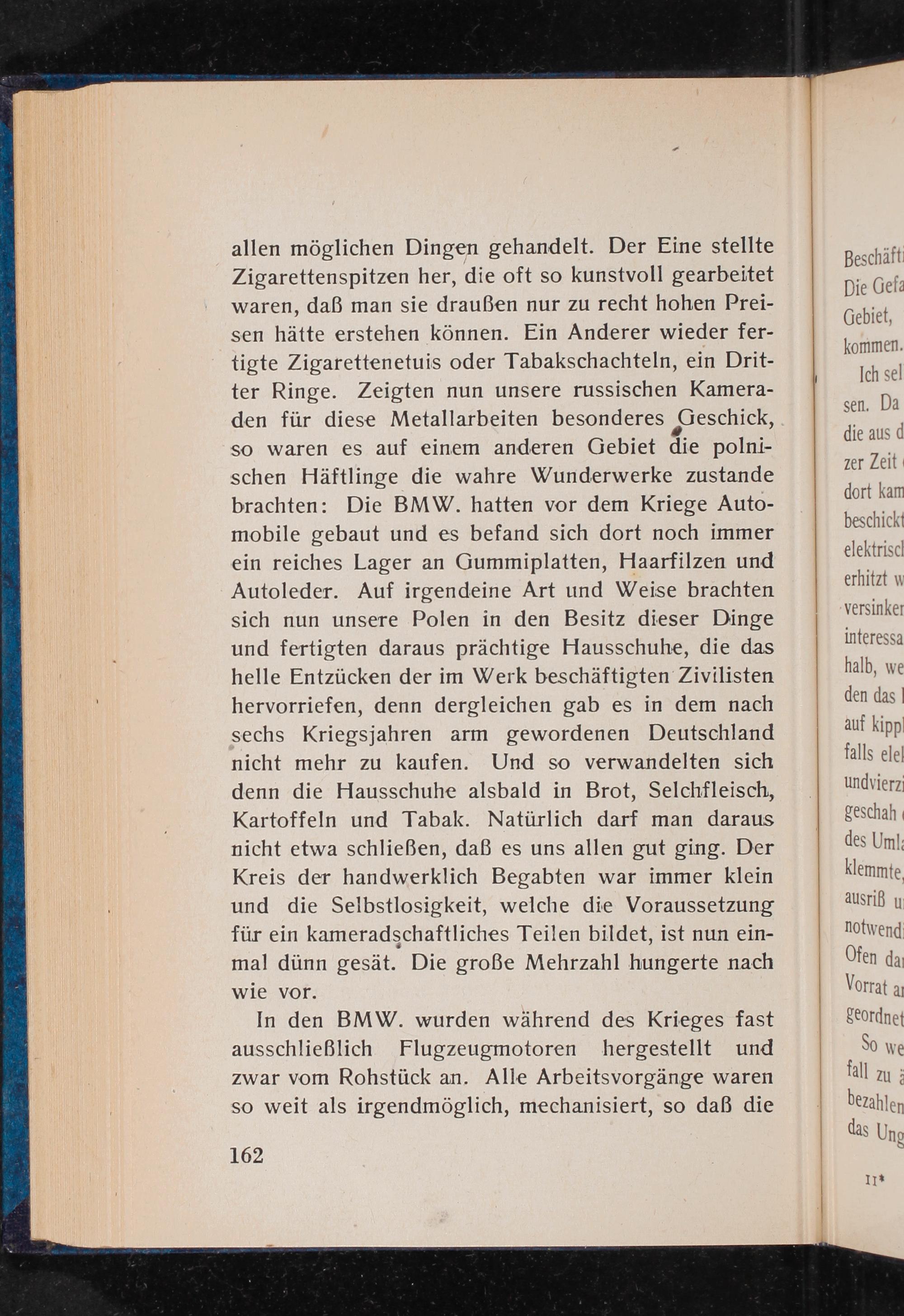 allen möglichen Dingen gehandelt. Der Eine stellte Zigarettenspitzen her, die oft so kunstvoll gearbeitet waren, daß man sie draußen nur zu recht hohen Preisen hätte erstehen können. Ein Anderer wieder fertigte Zigarettenetuis oder Tabakschachteln, ein Dritter Ringe. Zeigten nun unsere russischen Kameraden für diese Metallarbeiten besonderes Geschick, so waren es auf einem anderen Gebiet die polnischen Häftlinge die wahre Wunderwerke zustande brachten: Die BMW . hatten vor dem Kriege Automobile gebaut und es befand sich dort noch immer ein reiches Lager an Gummiplatten, Haarfilzen und Autoleder. Auf irgendeine Art und Weise brachten sich nun unsere Polen in den Besitz dieser Dinge und fertigten daraus prächtige Hausschuhe, die das helle Entzücken der im Werk beschäftigten Zivilisten hervorriefen, denn dergleichen gab es in dem nach sechs Kriegsjahren arm gewordenen Deutschland nicht mehr zu kaufen. Und so verwandelten sich denn die Hausschuhe alsbald in Brot, Selchfleisch, Kartoffeln und Tabak. Natürlich darf man daraus nicht etwa schließen, daß es uns allen gut ging. Der Kreis der handwerklich Begabten war immer klein und die Selbstlosigkeit, welche die Voraussetzung für ein kameradschaftliches Teilen bildet, ist nun einmal dünn gesät. Die große Mehrzahl hungerte nach wie vor.