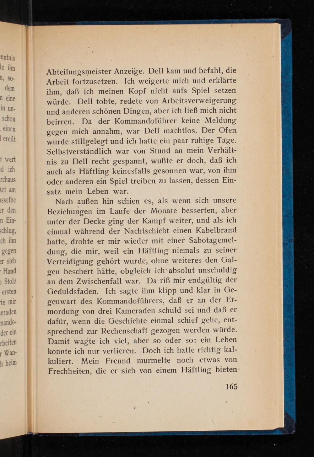 Abteilungsmeister Anzeige. Dell kam und befahl, die Arbeit fortzusetzen. Ich weigerte mich und erklärte ihm, daß ich meinen Kopf nicht aufs Spiel setzen würde. Dell tobte, redete von Arbeitsverweigerung und anderen schönen Dingen, aber ich ließ mich nicht beirren. Da der Kommandoführer keine Meldung gegen mich annahm, war Dell machtlos. Der Ofen wurde stillgelegt und ich hatte ein paar ruhige Tage. Selbstverständlich war von Stund an mein Verhältnis zu Dell recht gespannt, wußte er doch, daß ich auch als Häftling keinesfalls gesonnen war, von ihm oder anderen ein Spiel treiben zu lassen, dessen Einsatz mein Leben war.