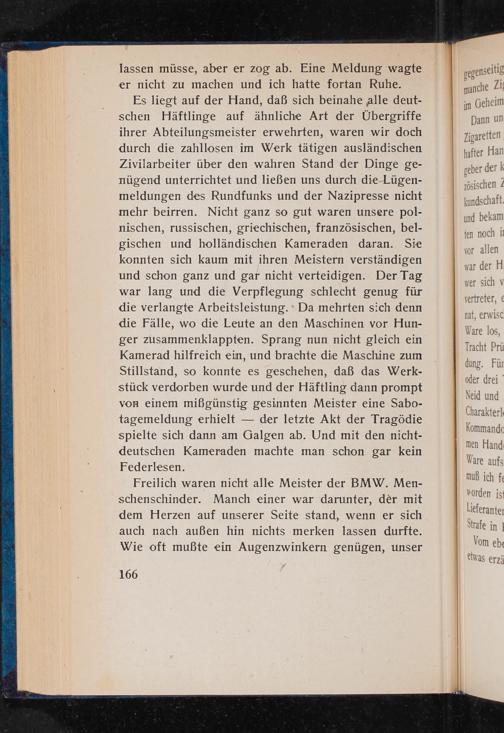 Freilich waren nicht alle Meister der BMW . Menschenschinder. Manch einer war darunter, der mit dem Herzen auf unserer Seite stand, wenn er sich auch nach außen hin nichts merken lassen durfte. Wie oft mußte ein Augenzwinkern genügen, unser