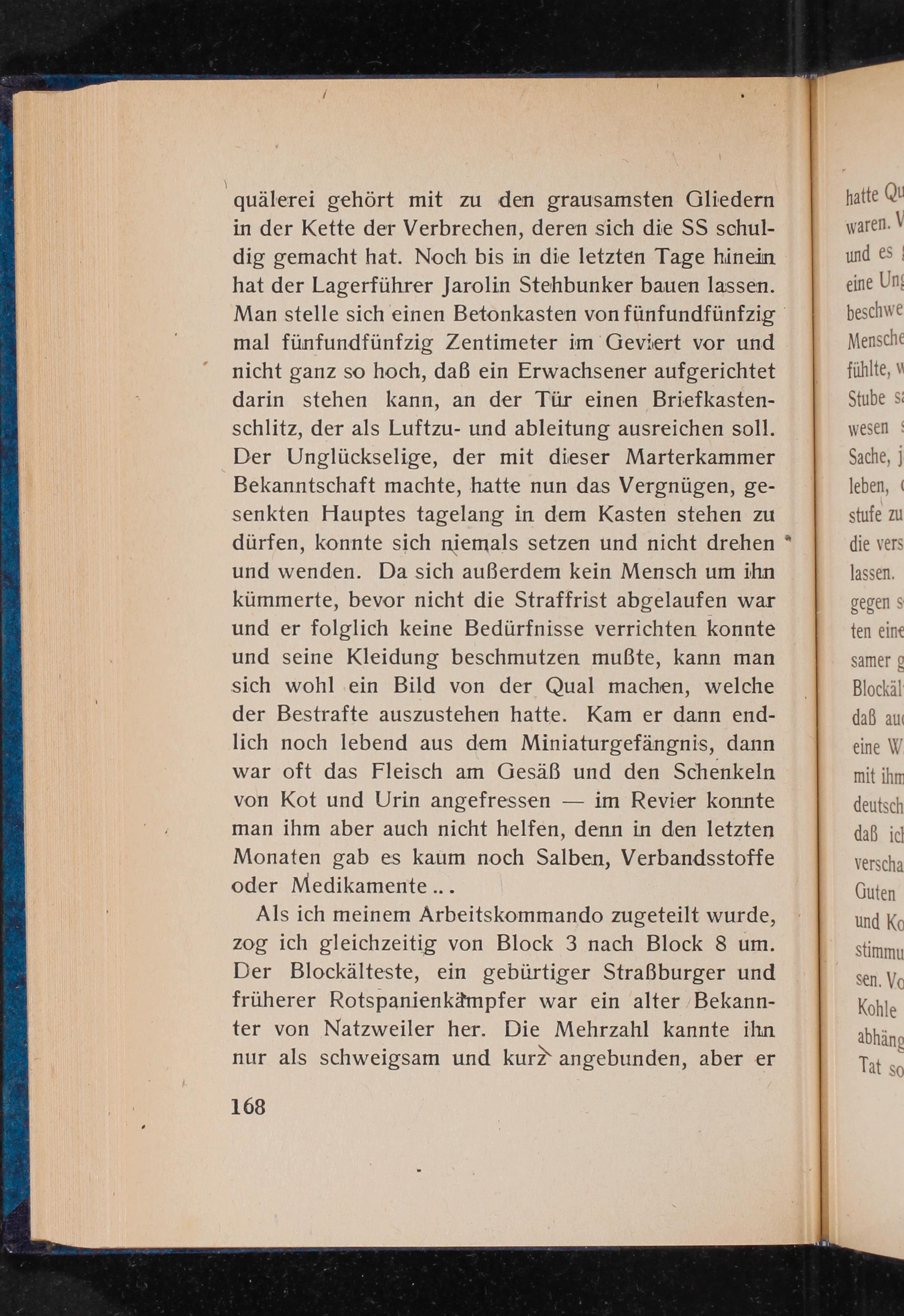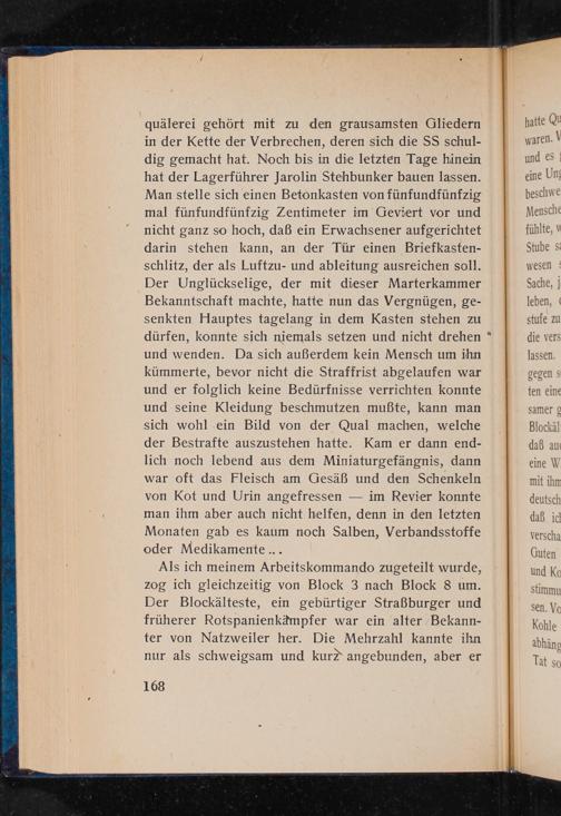 quälerei gehört mit zu den grausamsten Gliedern in der Kette der Verbrechen, deren sich die SS schuldig gemacht hat. Noch bis in die letzten Tage hinein hat der Lagerführer Jarolin Stehbunker bauen lassen. Man stelle sich einen Betonkasten von fünfundfünfzig mal fünfundfünfzig Zentimeter im Geviert vor und nicht ganz so hoch, daß ein Erwachsener aufgerichtet darin stehen kann, an der Tür einen Briefkastenschlitz, der als Luftzu- und ableitung ausreichen soll. Der Unglückselige, der mit dieser Marterkammer Bekanntschaft machte, hatte nun das Vergnügen, gesenkten Hauptes tagelang in dem Kasten stehen zu dürfen, konnte sich niemals setzen und nicht drehen" und wenden. Da sich außerdem kein Mensch um ihn kümmerte, bevor nicht die Straffrist abgelaufen war und er folglich keine Bedürfnisse verrichten konnte und seine Kleidung beschmutzen mußte, kann man sich wohl ein Bild von der Qual machen, welche der Bestrafte auszustehen hatte. Kam er dann endlich noch lebend aus dem Miniaturgefängnis, dann war oft das Fleisch am Gesäß und den Schenkeln von Kot und Urin angefressen im Revier konnte man ihm aber auch nicht helfen, denn in den letzten Monaten gab es kaum noch Salben, Verbandsstoffe oder Medikamente...