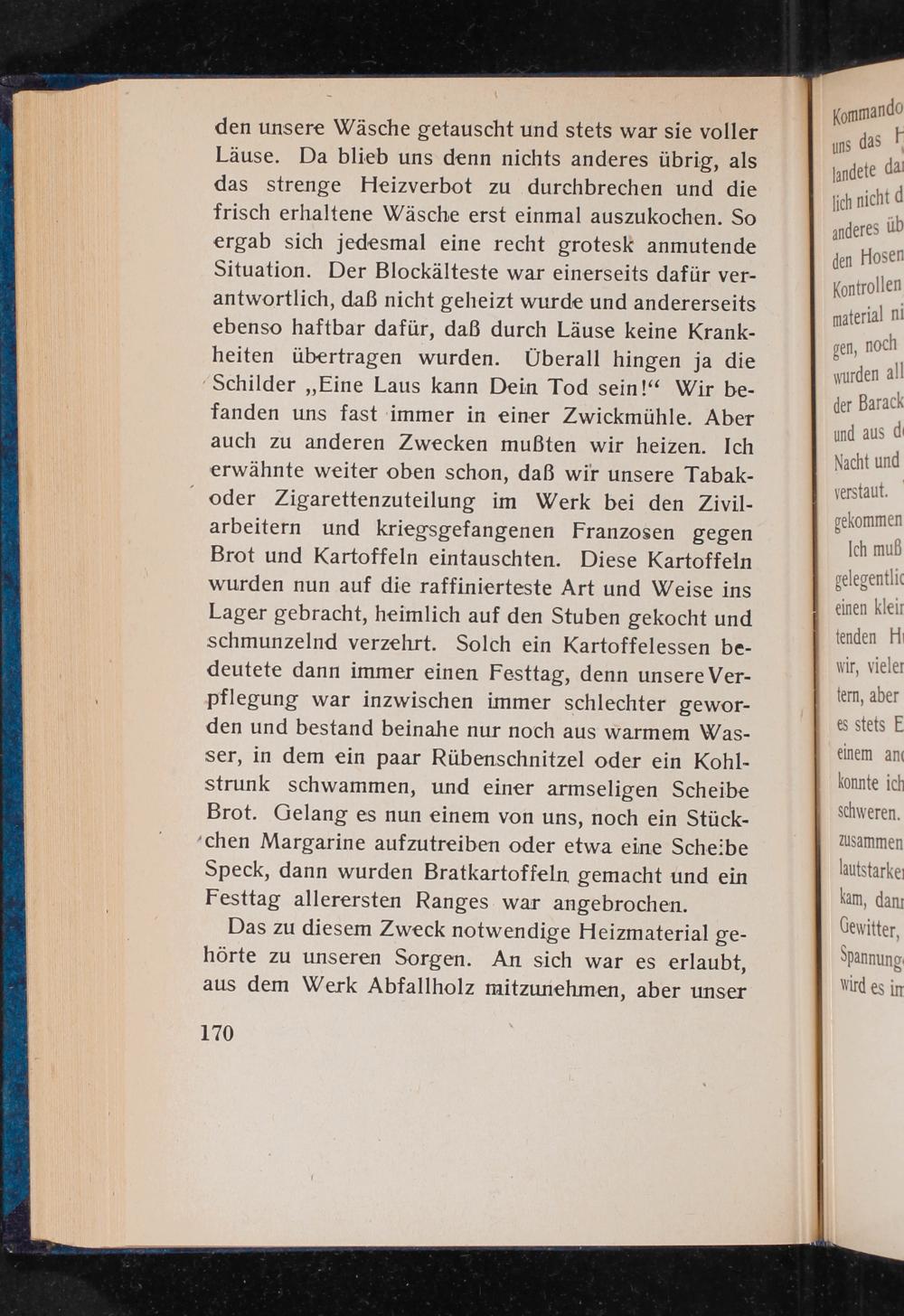 den unsere Wäsche getauscht und stets war sie voller Läuse. Da blieb uns denn nichts anderes übrig, als das strenge Heizverbot zu durchbrechen und die frisch erhaltene Wäsche erst einmal auszukochen. So ergab sich jedesmal eine recht grotesk anmutende Situation. Der Blockälteste war einerseits dafür verantwortlich, daß nicht geheizt wurde und andererseits ebenso haftbar dafür, daß durch Läuse keine Krankheiten übertragen wurden. Überall hingen ja die Schilder ,, Eine Laus kann Dein Tod sein!" Wir befanden uns fast immer in einer Zwickmühle. Aber auch zu anderen Zwecken mußten wir heizen. Ich erwähnte weiter oben schon, daß wir unsere Tabakoder Zigarettenzuteilung im Werk bei den Zivilarbeitern und kriegsgefangenen Franzosen gegen Brot und Kartoffeln eintauschten. Diese Kartoffeln wurden nun auf die raffinierteste Art und Weise ins Lager gebracht, heimlich auf den Stuben gekocht und schmunzelnd verzehrt. Solch ein Kartoffelessen bedeutete dann immer einen Festtag, denn unsere Verpflegung war inzwischen immer schlechter geworden und bestand beinahe nur noch aus warmem Wasser, in dem ein paar Rübenschnitzel oder ein Kohlstrunk schwammen, und einer armseligen Scheibe Brot. Gelang es nun einem von uns, noch ein Stückchen Margarine aufzutreiben oder etwa eine Scheibe Speck, dann wurden Bratkartoffeln gemacht und ein Festtag allerersten Ranges war angebrochen.