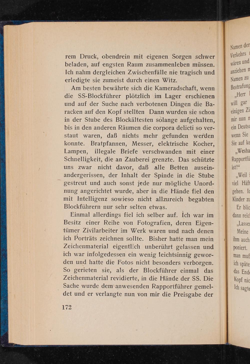 Einmal allerdings fiel ich selber auf. Ich war im Besitz einer Reihe von Fotografien, deren Eigentümer Zivilarbeiter im Werk waren und nach denen ich Porträts zeichnen sollte. Bisher hatte man mein Zeichenmaterial eigentlich unberührt gelassen und ich war infolgedessen ein wenig leichtsinnig geworden und hatte die Fotos nicht besonders verborgen. So gerieten sie, als der Blockführer einmal das Zeichenmaterial revidierte, in die Hände der SS. Die Sache wurde dem anwesenden Rapportführer gemeldet und er verlangte nun von mir die Preisgabe der