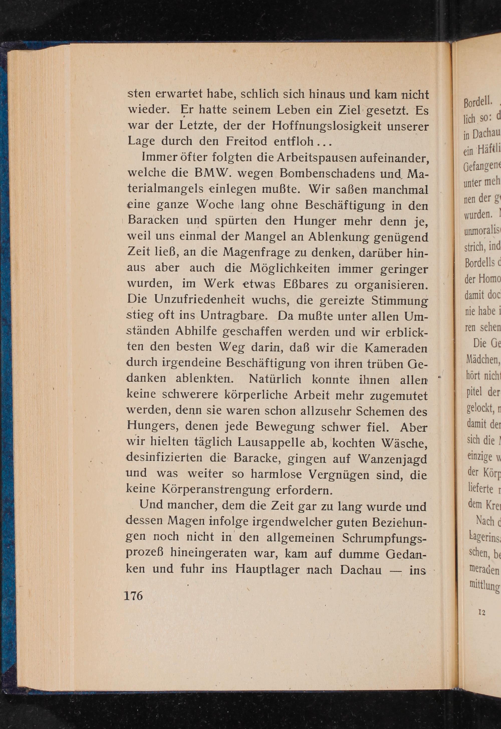 Immer öfter folgten die Arbeitspausen aufeinander, welche die BMW . wegen Bombenschadens und Materialmangels einlegen mußte. Wir saßen manchmal eine ganze Woche lang ohne Beschäftigung in den Baracken und spürten den Hunger mehr denn je, weil uns einmal der Mangel an Ablenkung genügend Zeit ließ, an die Magenfrage zu denken, darüber hinaus aber auch die Möglichkeiten immer geringer wurden, im Werk etwas Eẞbares zu organisieren. Die Unzufriedenheit wuchs, die gereizte Stimmung stieg oft ins Untragbare. Da mußte unter allen Umständen Abhilfe geschaffen werden und wir erblickten den besten Weg darin, daß wir die Kameraden durch irgendeine Beschäftigung von ihren trüben Gedanken ablenkten. Natürlich konnte ihnen allen keine schwerere körperliche Arbeit mehr zugemutet werden, denn sie waren schon allzusehr Schemen des Hungers, denen jede Bewegung schwer fiel. Aber wir hielten täglich Lausappelle ab, kochten Wäsche, desinfizierten die Baracke, gingen auf Wanzenjagd und was weiter so harmlose Vergnügen sind, die keine Körperanstrengung erfordern.