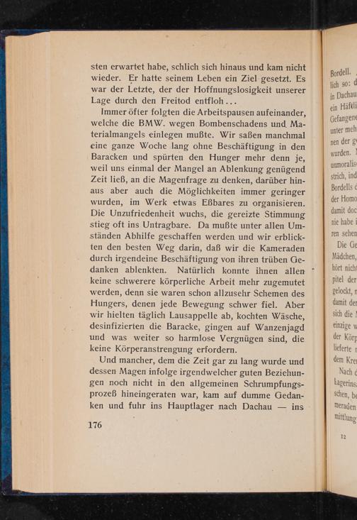 Und mancher, dem die Zeit gar zu lang wurde und dessen Magen infolge irgendwelcher guten Beziehungen noch nicht in den allgemeinen Schrumpfungsprozeß hineingeraten war, kam auf dumme Gedanken und fuhr ins Hauptlager nach Dachau ins