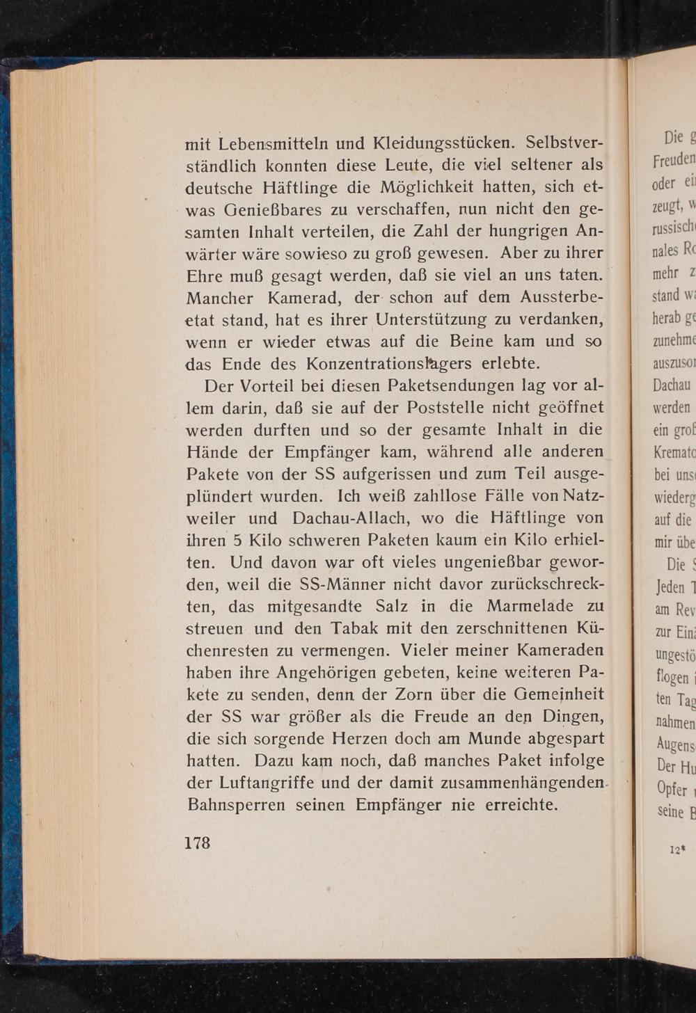 mit Lebensmitteln und Kleidungsstücken. Selbstverständlich konnten diese Leute, die viel seltener als deutsche Häftlinge die Möglichkeit hatten, sich etwas Genießbares zu verschaffen, nun nicht den gesamten Inhalt verteilen, die Zahl der hungrigen Anwärter wäre sowieso zu groß gewesen. Aber zu ihrer Ehre muß gesagt werden, daß sie viel an uns taten. Mancher Kamerad, der schon auf dem Aussterbeetat stand, hat es ihrer Unterstützung zu verdanken, wenn er wieder etwas auf die Beine kam und so das Ende des Konzentrationslagers erlebte.