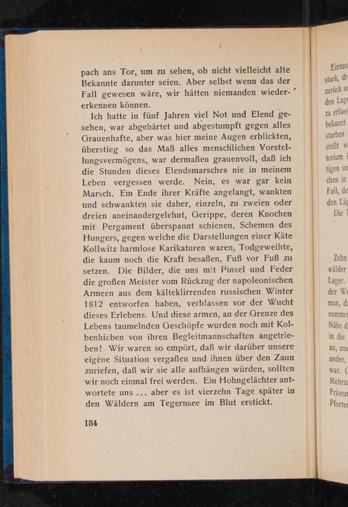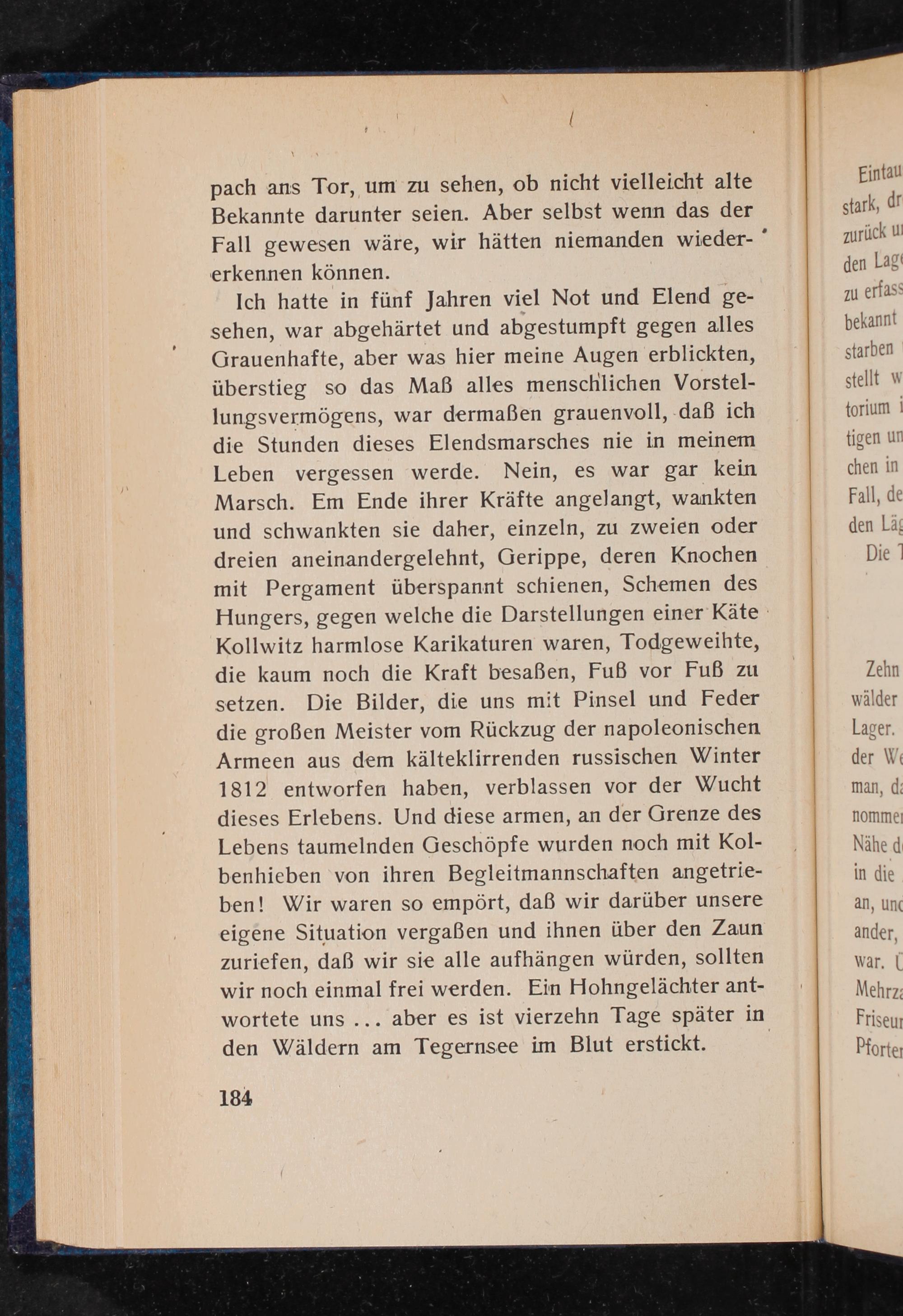 Ich hatte in fünf Jahren viel Not und Elend gesehen, war abgehärtet und abgestumpft gegen alles Grauenhafte, aber was hier meine Augen erblickten, überstieg so das Maß alles menschlichen Vorstellungsvermögens, war dermaßen grauenvoll, daß ich die Stunden dieses Elendsmarsches nie in meinem Leben vergessen werde. Nein, es war gar kein Marsch. Em Ende ihrer Kräfte angelangt, wankten und schwankten sie daher, einzeln, zu zweien oder dreien aneinandergelehnt, Gerippe, deren Knochen mit Pergament überspannt schienen, Schemen des Hungers, gegen welche die Darstellungen einer Käte Kollwitz harmlose Karikaturen waren, Todgeweihte, die kaum noch die Kraft besaßen, Fuß vor Fuß zu setzen. Die Bilder, die uns mit Pinsel und Feder die großen Meister vom Rückzug der napoleonischen Armeen aus dem kälteklirrenden russischen Winter 1812 entworfen haben, verblassen vor der Wucht dieses Erlebens. Und diese armen, an der Grenze des Lebens taumelnden Geschöpfe wurden noch mit Kolbenhieben von ihren Begleitmannschaften angetrieben! Wir waren so empört, daß wir darüber unsere eigene Situation vergaßen und ihnen über den Zaun zuriefen, daß wir sie alle aufhängen würden, sollten wir noch einmal frei werden. Ein Hohngelächter antwortete uns... aber es ist vierzehn Tage später in den Wäldern am Tegernsee im Blut erstickt.