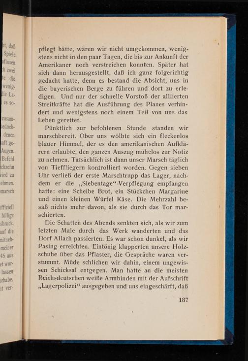 pflegt hätte, wären wir nicht umgekommen, wenig- stens nicht in den paar Tagen, die bis zur Ankunft der Amerikaner noch verstreichen konnten. Später hat sich dann herausgestellt, daß ich ganz folgerichtig gedacht hatte, denn es bestand die Absicht, uns in die bayerischen Berge zu führen und dort zu erle- digen. Und nur der schnelle Vorstoß der alliierten Streitkräfte hat die Ausführung des Planes verhin- dert und wenigstens noch einem Teil von uns das Leben gerettet.