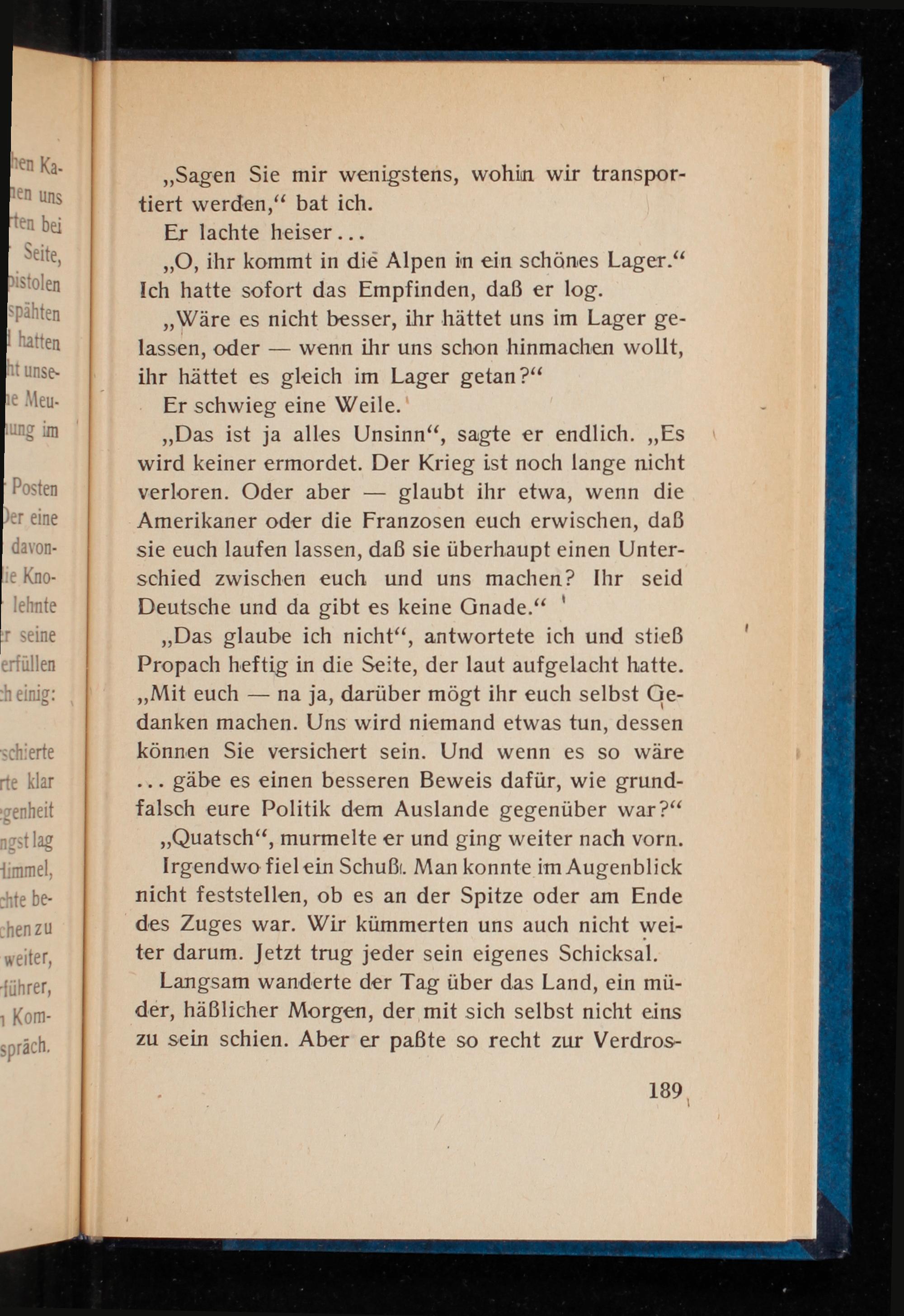 „Das ist ja alles Unsinn“, sagte er endlich.„Es wird keiner ermordet. Der Krieg ist noch lange nicht verloren. Oder aber— glaubt ihr etwa, wenn die Amerikaner oder die Franzosen euch erwischen, daß sie euch laufen lassen, daß sie überhaupt einen Unter- schied zwischen euch und uns machen? Ihr seid Deutsche und da gibt es keine Gnade.“'
