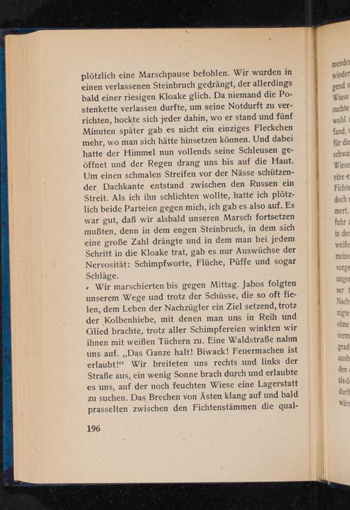 . Wir marschierten bis gegen Mittag. Jabos folgten unserem Wege und trotz der Schüsse, die so oft fielen, dem Leben der Nachzügler ein Ziel setzend, trotz der Kolbenhiebe, mit denen man uns in Reih und Glied brachte, trotz aller Schimpfereien winkten wir ihnen mit weißen Tüchern zu. Eine Waldstraße nahm uns auf. ,, Das Ganze halt! Biwack! Feuermachen ist erlaubt!" Wir breiteten uns rechts und links der Straße aus, ein wenig Sonne brach durch und erlaubte es uns, auf der noch feuchten Wiese eine Lagerstatt zu suchen. Das Brechen von Ästen klang auf und bald prasselten zwischen den Fichtenstämmen die qual