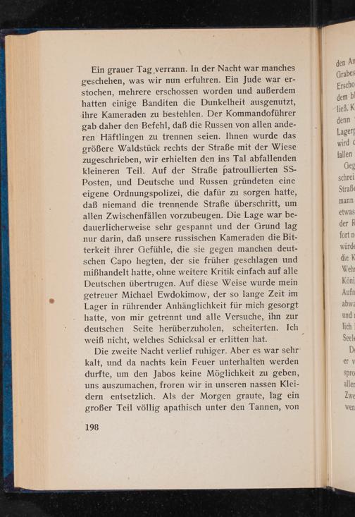 Ein grauer Tag verrann. In der Nacht war manches geschehen, was wir nun erfuhren. Ein Jude war erstochen, mehrere erschossen worden und außerdem hatten einige Banditen die Dunkelheit ausgenutzt, ihre Kameraden zu bestehlen. Der Kommandoführer gab daher den Befehl, daß die Russen von allen anderen Häftlingen zu trennen seien. Ihnen wurde das größere Waldstück rechts der Straße mit der Wiese zugeschrieben, wir erhielten den ins Tal abfallenden kleineren Teil. Auf der Straße patroullierten SSPosten, und Deutsche und Russen gründeten eine eigene Ordnungspolizei, die dafür zu sorgen hatte, daẞ niemand die trennende Straße überschritt, um allen Zwischenfällen vorzubeugen. Die Lage war bedauerlicherweise sehr gespannt und der Grund lag nur darin, daß unsere russischen Kameraden die Bitterkeit ihrer Gefühle, die sie gegen manchen deutschen Capo hegten, der sie früher geschlagen und mißhandelt hatte, ohne weitere Kritik einfach auf alle Deutschen übertrugen. Auf diese Weise wurde mein getreuer Michael Ewdokimow, der so lange Zeit im Lager in rührender Anhänglichkeit für mich gesorgt hatte, von mir getrennt und alle Versuche, ihn zur deutschen Seite herüberzuholen, scheiterten. Ich weiß nicht, welches Schicksal er erlitten hat.