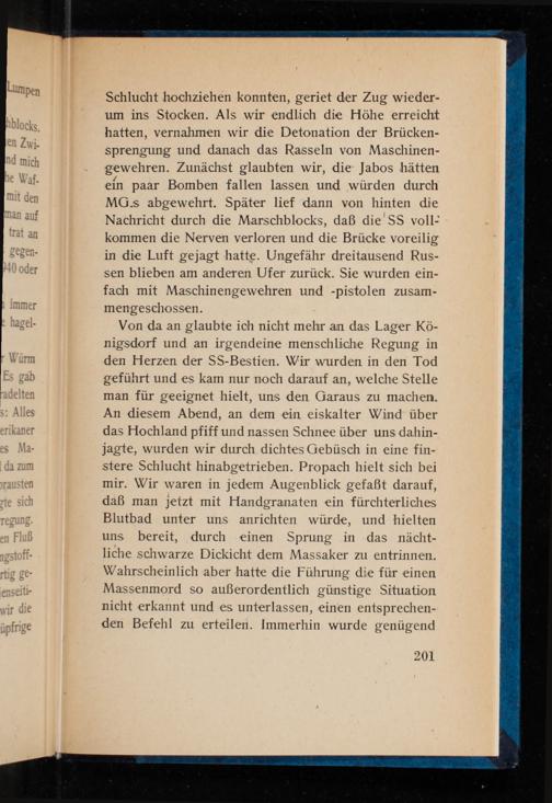 Von da an glaubte ich nicht mehr an das Lager Kö- nigsdorf und an irgendeine menschliche Regung in den Herzen der SS-Bestien. Wir wurden in den Tod geführt und es kam nur noch darauf an, welche Stelle man für geeignet hielt, uns den Garaus zu machen. An diesem Abend, an dem ein eiskalter Wind über das Hochland pfiff und nassen Schnee über uns dahin- jagte, wurden wir durch dichtes Gebüsch in eine fin- stere Schlucht hinabgetrieben. Propach hielt sich bei mir. Wir waren in jedem Augenblick gefaßt darauf, daß man jetzt mit Handgranaten ein fürchterliches Blutbad unter uns anrichten würde, und hielten uns bereit, durch einen Sprung in das nächt- liche schwarze Dickicht dem Massaker zu entrinnen. Wahrscheinlich aber hatte die Führung die für einen Massenmord so außerordentlich günstige Situation nicht erkannt und es unterlassen, einen entsprechen- den Befehl zu erteilen. Immerhin wurde genügend