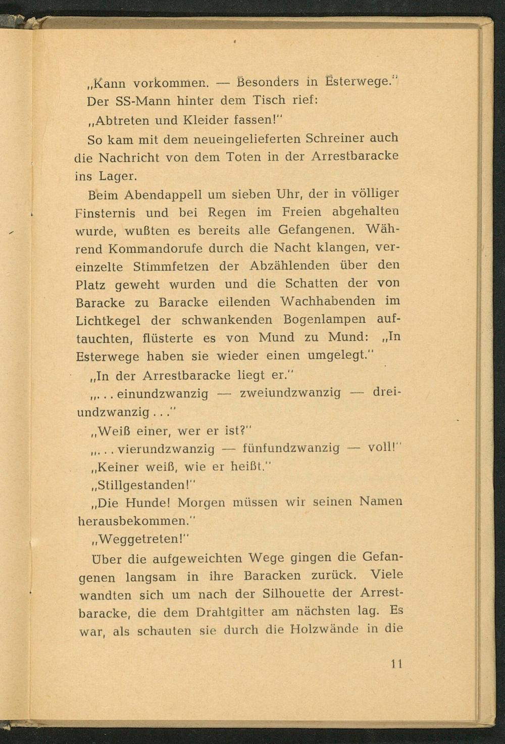 Beim Abendappell um sieben Uhr, der in völliger Finsternis und bei Regen im Freien abgehalten. wurde, wußten es bereits alle Gefangenen. Während Kommandorufe durch die Nacht klangen, vereinzelte Stimmfetzen der Abzählenden über den Platz geweht wurden und die Schatten der von Baracke zu Baracke eilenden Wachhabenden im Lichtkegel der schwankenden Bogenlampen auftauchten, flüsterte es von Mund zu Mund: ,, In Esterwege haben sie wieder einen umgelegt." ,, In der Arrestbaracke liegt er."