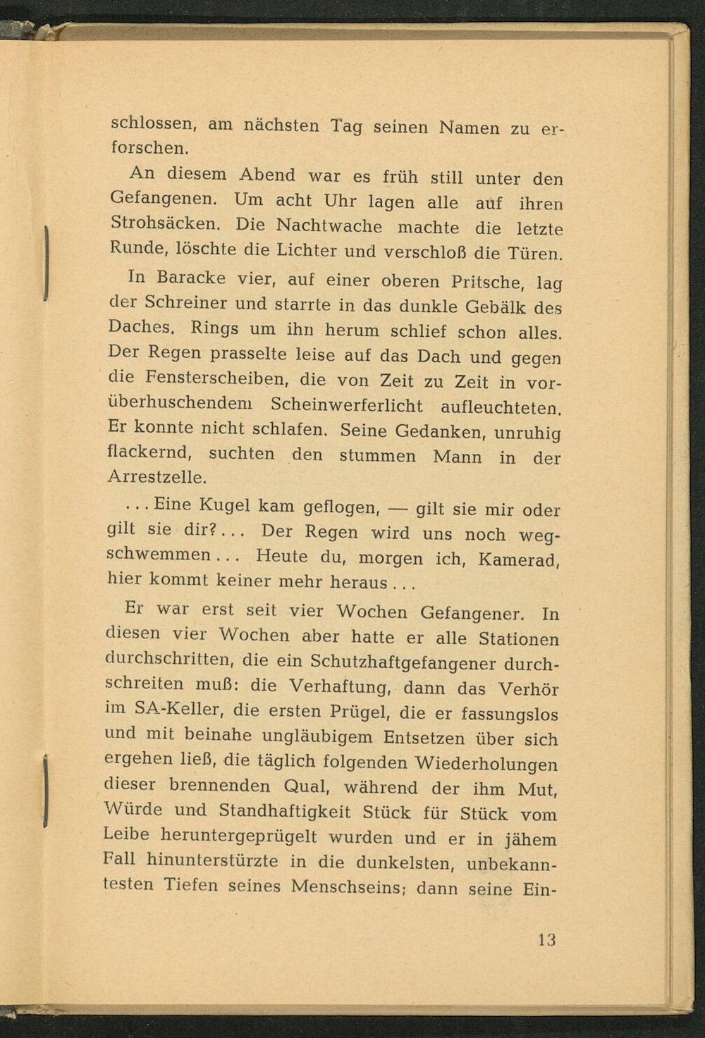 Er war erst seit vier Wochen Gefangener. In diesen vier Wochen aber hatte er alle Stationen durchschritten, die ein Schutzhaftgefangener durchschreiten muß: die Verhaftung, dann das Verhör im SA- Keller, die ersten Prügel, die er fassungslos und mit beinahe ungläubigem Entsetzen über sich ergehen ließ, die täglich folgenden Wiederholungen dieser brennenden Qual, während der ihm Mut, Würde und Standhaftigkeit Stück für Stück vom Leibe heruntergeprügelt wurden und er in jähem Fall hinunterstürzte in die dunkelsten, unbekanntesten Tiefen seines Menschseins; dann seine Ein