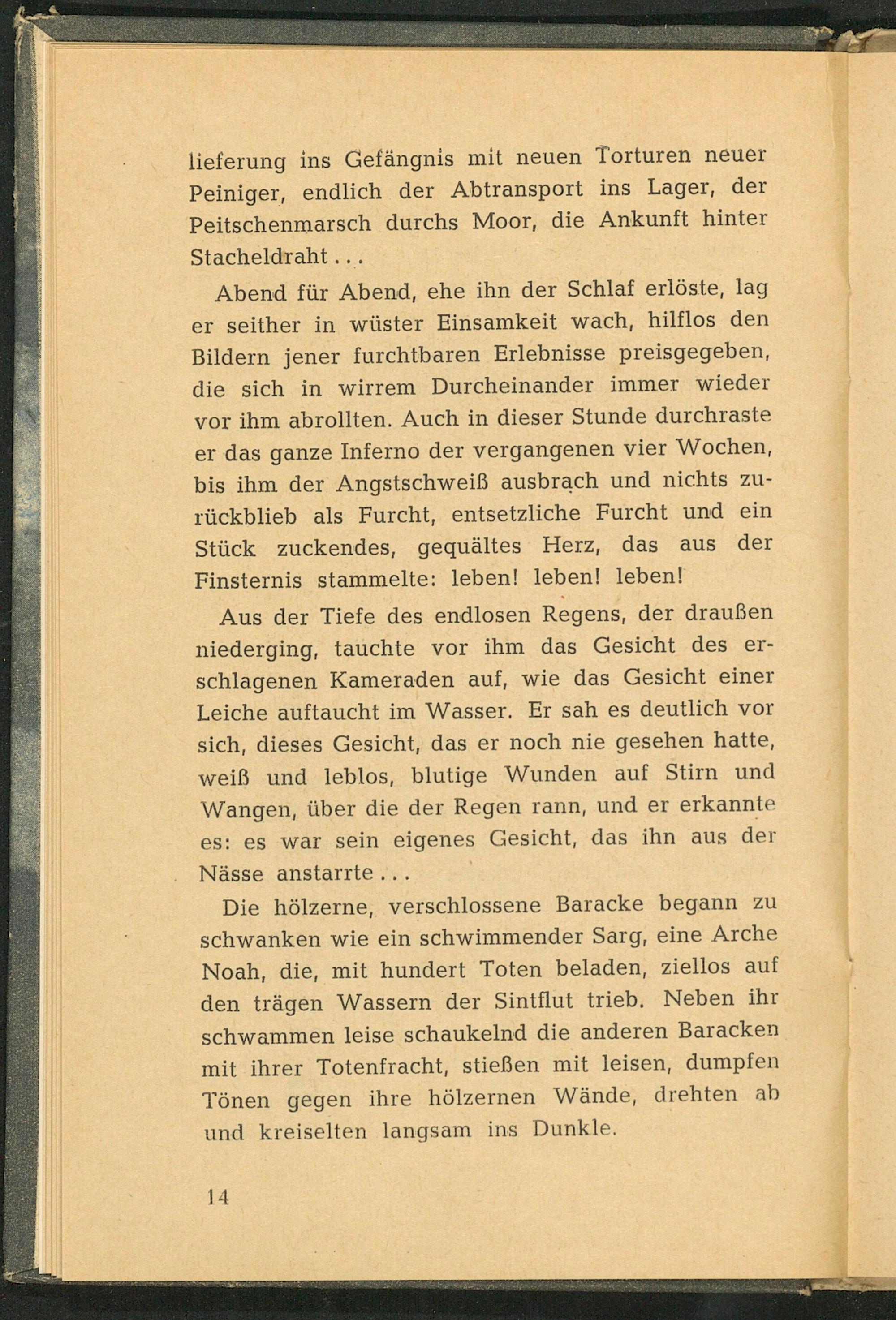 lieferung ins Gefängnis mit neuen Torturen neuer Peiniger, endlich der Abtransport ins Lager, der Peitschenmarsch durchs Moor, die Ankunft hinter Stacheldraht....